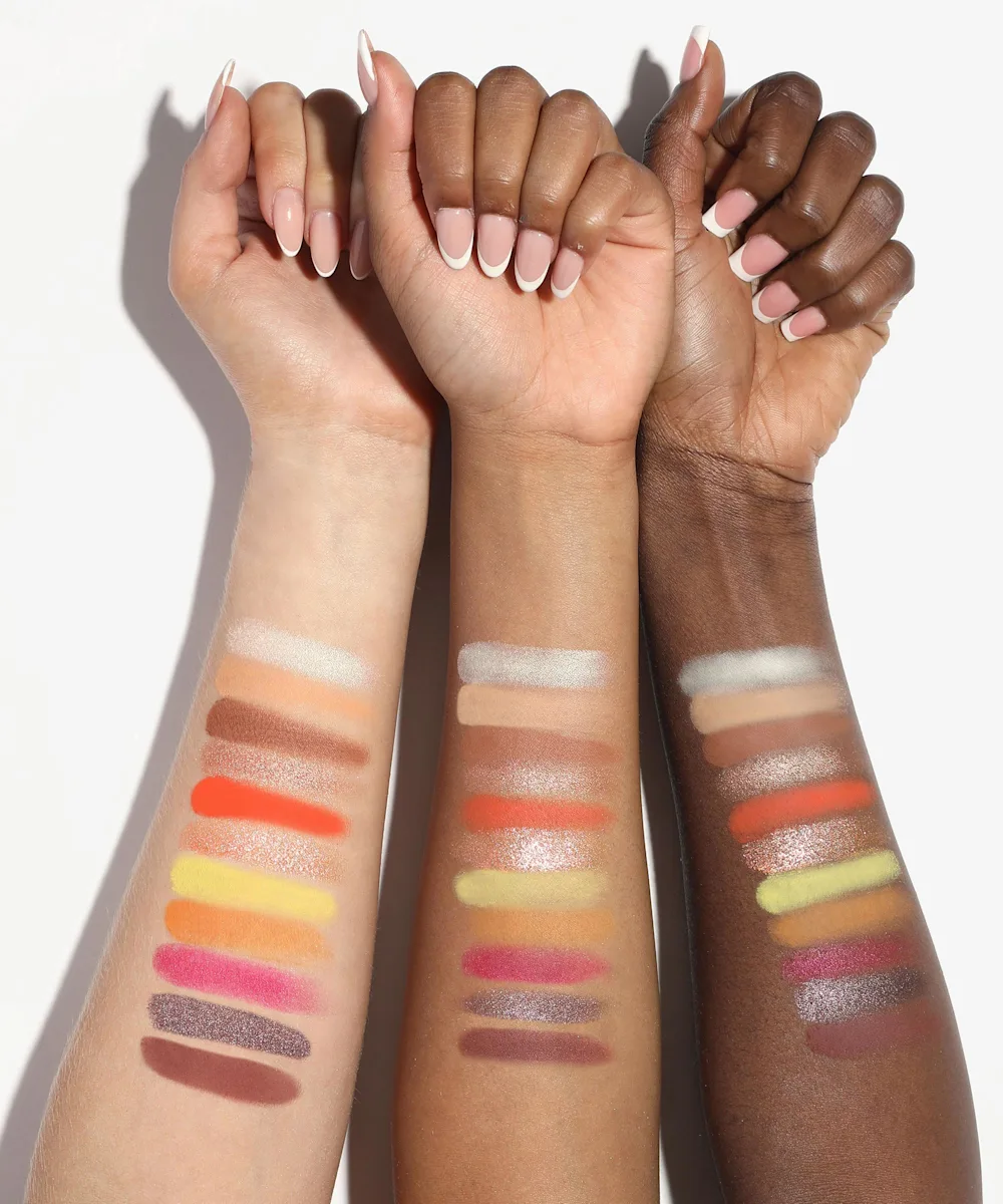 By BEAUTY BAY Fiery 2.0 42 Colour Palette: Silk, Fairy, Brunette, Acorn, Conker, Bagel, Papaya, Peel, Spice, Sherbert, Blonde, Turmeric, Lipstick, Sour, Autumn, Peach, Warm, Wood, Wine: Talc, Mica, Silica, Triethoxycaprylylsilane, Ethylhexyl Palmitate, Polyisobutene, Magnesium Stearate, Dimethicone, Bis-Diglyceryl Polyacyladipate-2, Tridecyl Trimellitate, Phenoxyethanol, Tocopheryl Acetate, Ethylhexylglycerin. May Contain (+/-): Yellow 6 Lake (Ci 15985), Yellow 5 Lake (Ci 19140), Yellow 10 Lake (Ci 47005), Iron Oxides (Ci 77491, Ci 77492, Ci 77499), Red 6 Lake (Ci 15850), Titanium Dioxide (Ci 77891), Red 7 Lake (Ci 15850), Red 27 Lake (Ci 45410), Ultramarines (Ci 77007), Red 6 (Ci 15850). Ginger, Pumpkin: Mica, Talc, Synthetic Fluorphlogopite, Polyisobutene, Bis-Diglyceryl Polyacyladipate-2, Dimethicone, Tridecyl Trimellitate, Magnesium Stearate, Tin Oxide, Phenoxyethanol, Triethoxycaprylylsilane, Tocopheryl Acetate, Ethylhexylglycerin. May Contain (+/-): Titanium Dioxide (Ci 77891), Iron Oxides (Ci 77491, Ci 77492, Ci 77499), Yellow 6 Lake (Ci 15985), Yellow 5 Lake (Ci 19140), Red 6 (Ci 15850). Laces, Daffodil, Rush, Cappucino: Talc, Mica, Ethylhexyl Palmitate, Polyisobutene, Bis-Diglyceryl Polyacyladipate-2, Tridecyl Trimellitate, Dimethicone, Magnesium Stearate, Triethoxycaprylylsilane, Phenoxyethanol, Tocopheryl Acetate, Ethylhexylglycerin. May Contain (+/-): Yellow 10 Lake (Ci 47005), Iron Oxides (Ci 77491, Ci 77492, Ci 77499), Red 7 Lake (Ci 15850), Red 28 Lake (Ci 45410), Yellow 5 Lake (Ci 19140), Red 6 (Ci 15850), Titanium Dioxide (Ci 77891), Red 6 Lake (Ci 15850), Red 27 Lake (Ci 45410), Chromium Oxide Greens (Ci 77288). Meringue, Raven: Mica, Talc, Silica, Ethylhexyl Palmitate, Magnesium Stearate, Bis-Diglyceryl Polyacyladipate-2, Dimethicone, Phenoxyethanol, Polyisobutene, Tocopheryl Acetate, Ethylhexylglycerin. May Contain (+/-): Iron Oxides (Ci 77491, Ci 77492, Ci 77499), Titanium Dioxide (Ci 77891), Ultramarines (Ci 77007), Red 27 Lake (Ci 45410), Yellow 5 Lake (Ci 19140). Saffron: Mica, Talc, Silica, Ethylhexyl Palmitate, Magnesium Stearate, Bis-Diglyceryl Polyacyladipate-2, Dimethicone, Phenoxyethanol, Polyisobutene, Ethylhexylglycerin, Red 27 Lake (Ci 45410), Red 7 Lake (Ci 15850), Ultramarines (Ci 77007), Iron Oxides (Ci 77491, Ci 77499), Titanium Dioxide (Ci 77891). Fizzy: Mica, Talc, Ethylhexyl Palmitate, Bis-Diglyceryl Polyacyladipate-2, Tridecyl Trimellitate, Dimethicone, Magnesium Stearate, Polyisobutene, Phenoxyethanol, Tocopheryl Acetate, Ethylhexylglycerin, Iron Oxides (Ci 77491, Ci 77492, Ci 77499). Soft: Mica, Talc, Ethylhexyl Palmitate, Bis-Diglyceryl Polyacyladipate-2, Dimethicone, Polyisobutene, Magnesium Stearate, Phenoxyethanol, Triethoxycaprylylsilane, Tocopheryl Acetate, Ethylhexylglycerin, Titanium Dioxide (Ci 77891), Iron Oxides (Ci 77491, Ci 77492). Fudge: Mica, Talc, Ethylhexyl Palmitate, Bis-Diglyceryl Polyacyladipate-2, Tridecyl Trimellitate, Dimethicone, Polyisobutene, Phenoxyethanol, Tocopheryl Acetate, Ethylhexylglycerin, Iron Oxides (Ci 77491, Ci 77492, Ci 77499). Titanium Dioxide (Ci 77891), Cork: Mica, Talc, Silica, Ethylhexyl Palmitate, Magnesium Stearate, Bis-Diglyceryl Polyacyladipate-2, Dimethicone, Triethoxycaprylylsilane, Phenoxyethanol, Polyisobutene, Tocopheryl Acetate, Ethylhexylglycerin, Iron Oxides (Ci 77491, Ci 77492, Ci 77499), Titanium Dioxide (Ci 77891). Champagne: Mica, Talc, Ethylhexyl Palmitate, Bis-Diglyceryl Polyacyladipate-2, Tridecyl Trimellitate, Dimethicone, Magnesium Stearate, Polyisobutene, Tin Oxide, Phenoxyethanol, Tocopheryl Acetate, Ethylhexylglycerin, Iron Oxides (Ci 77491, Ci 77492, Ci 77499), Titanium Dioxide (Ci 77891). Shell: Talc, Mica, Ethylhexyl Palmitate, Polyisobutene, Magnesium Stearate, Dimethicone, Triethoxycaprylylsilane, Bis-Diglyceryl Polyacyladipate-2, Tridecyl Trimellitate, Tin Oxide, Phenoxyethanol, Calcium Aluminum Borosilicate, Tocopheryl Acetate, Ethylhexylglycerin, Titanium Dioxide (Ci 77891), Iron Oxides (Ci 77491, Ci 77492). Sun: Mica, Talc, Ethylhexyl Palmitate, Caprylic/Capric Triglyceride, Bis-Diglyceryl Polyacyladipate-2, Tridecyl Trimellitate, Dimethicone, Polyisobutene, Magnesium Stearate, Phenoxyethanol, Mineral Oil (Paraffinum Liquidum), Dimethicone/Vinyl Dimethicone Crosspolymer, Cyclopentasiloxane, Triethoxycaprylylsilane, Tocopheryl Acetate, Tin Oxide, Ethylhexylglycerin, Titanium Dioxide (Ci 77891), Yellow 5 Lake (Ci 19140), Iron Oxides (Ci 77491). Tiger: Mica, Talc, Ethylhexyl Palmitate, Caprylic/Capric Triglyceride, Polyisobutene, Bis-Diglyceryl Polyacyladipate-2, Tridecyl Trimellitate, Dimethicone, Calcium Aluminum Borosilicate, Synthetic Fluorphlogopite, Magnesium Stearate, Phenoxyethanol, Tin Oxide, Tocopheryl Acetate, Ethylhexylglycerin, Titanium Dioxide (Ci 77891), Iron Oxides (Ci 77491, Ci 77492). Honey: Mica, Talc, Synthetic Fluorphlogopite, Ethylhexyl Palmitate, Bis-Diglyceryl Polyacyladipate-2, Tridecyl Trimellitate, Dimethicone, Calcium Aluminum Borosilicate, Polyisobutene, Magnesium Stearate, Phenoxyethanol, Tocopheryl Acetate, Ethylhexylglycerin, Tin Oxide, Titanium Dioxide (Ci 77891), Iron Oxides (Ci 77491, Ci 77492). Kisses: Mica, Talc, Ethylhexyl Palmitate, Polyisobutene, Caprylic/Capric Triglyceride, Synthetic Fluorphlogopite, Bis-Diglyceryl Polyacyladipate-2, Tridecyl Trimellitate, Dimethicone, Magnesium Stearate, Calcium Aluminum Borosilicate, Phenoxyethanol, Tocopheryl Acetate, Ethylhexylglycerin, Red 6 Lake (Ci 15850), Iron Oxides (Ci 77491), Red 6 (Ci 15850). Firework: Mica, Talc, Ethylhexyl Palmitate, Polyisobutene, Caprylic/Capric Triglyceride, Dimethicone, Bis-Diglyceryl Polyacyladipate-2, Tridecyl Trimellitate, Synthetic Fluorphlogopite, Magnesium Stearate, Calcium Aluminum Borosilicate, Cyclopentasiloxane, Dimethicone/Vinyl Dimethicone Crosspolymer, Triethoxycaprylylsilane, Tocopheryl Acetate, Ethylhexylglycerin, Iron Oxides (Ci 77491, Ci 77499), Titanium Dioxide (Ci 77891). Ribbon: Mica, Talc, Ethylhexyl Palmitate, Synthetic Fluorphlogopite, Bis-D