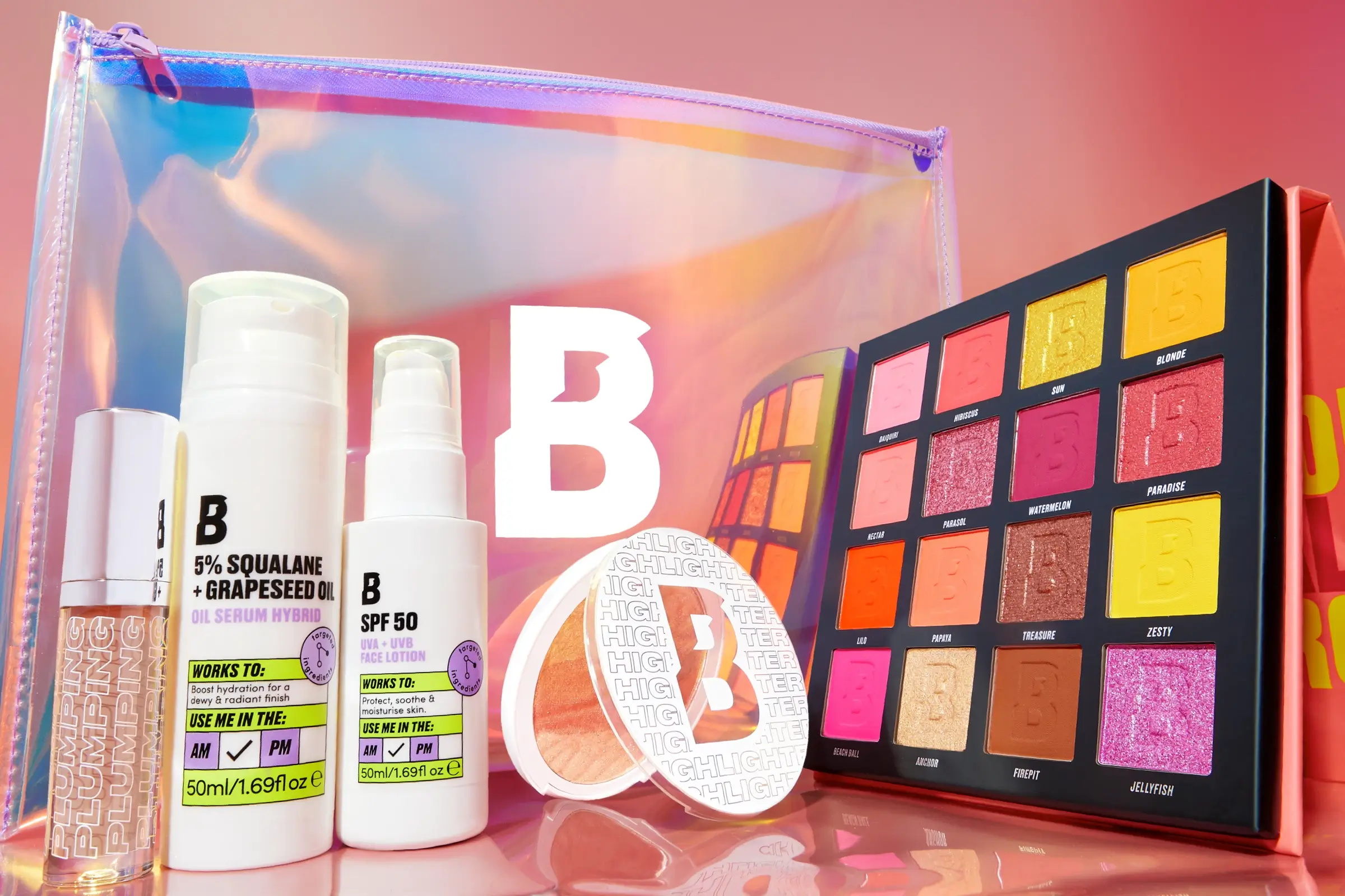 Daiquiri, Hibiscus, Blonde, Nectar, Watermelon, Lilo, Zesty, Beach Ball, Firepit, Papaya: Talc, Mica, Silica, Triethoxycaprylylsilane, Ethylhexyl Palmitate, Polyisobutene, Magnesium Stearate, Bis-Diglyceryl Polyacyladipate-2, Tridecyl Trimellitate, Dimethicone, Phenoxyethanol, Caprylyl Glycol, Tocopheryl Acetate, 1,2-Hexanediol, Ethylhexylglycerin (+/-) Red 27 Lake (Ci 45410), Yellow 5 Lake (Ci 19140), Iron Oxides (Ci 77491, Ci 77492, Ci 77499), Titanium Dioxide (Ci 77891), Red 6 (Ci 15850), Yellow 6 Lake (Ci 15985), Yellow 10 Lake (Ci 47005), Blue 1 Lake (Ci 42090).