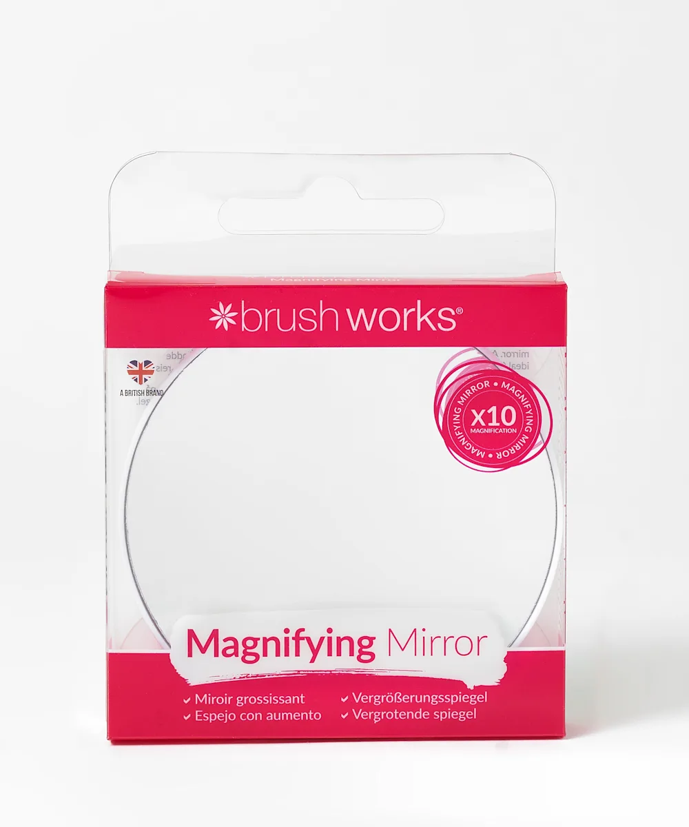 اقتربd بشكل وثيق وشخصي من Brushworks’ Magnifying Mirror. صُممت المرآة المكبرة 10x لجعل وضع الماكياج والعناية بالبشرة والتبرج أسهل ، وهي اكسسوار الجمال المثالي. مع مقبض شفاف على الظهر ، تكون المرآة محمولة وعملية ومثالية للاستخدام بدون استخدام اليدين أثناء نتف الحواجب ووضع العدسات اللاصقة.