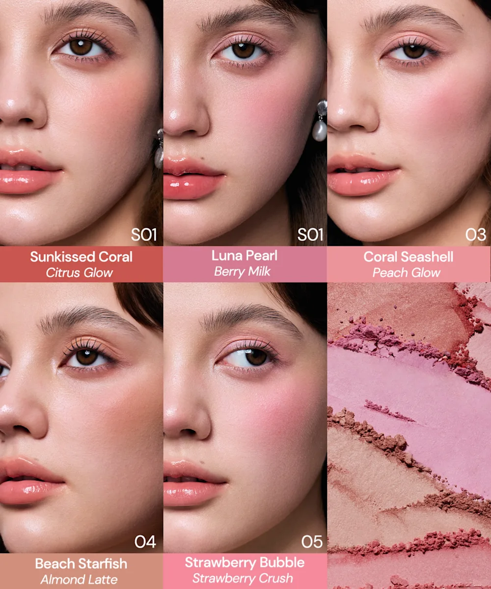 Coral Seashell: Mica, Synthetic Fluorphlogopite, Cetyl Ethylhexanoate, Silica, Polysorbate 60, Glycerin, Triethoxycaprylylsilane, Caprylyl Glycol, Aluminum Hydroxide, Ethylhexylglycerin, Chlorphenesin, Chondrus Crispus, Water, Alumina, Squalane, Tocopheryl Acetate, Tin Oxide, Titanium Dioxide(CI 77891), Iron Oxides(CI 77491), Red 30(CI 73360), Ultramarines(CI 77007), Iron Oxides(CI 77499)