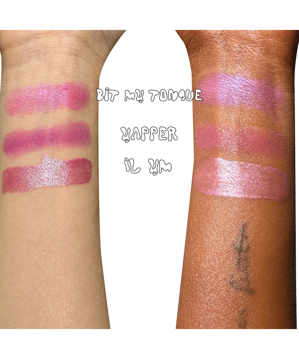 Blursh Balm In Yapper: Polyisobutene, Hydrogenated Polydecene, Ozokerite, Diisostearyl Malate, Pentaerythrityl Tetraisostearate, Petrolatum, Hydrogenated Polyisobutene, Mica, Bis-Diglyceryl Polyacyladipate-2, Polyethylene, Microstalline Wax, Butyrospermum Parkii Butter (Shea Butter), Beeswax (Cera Alba), Tocopheryl Acetate, [+/-: Titanium Dioxide (Ci 77891), Iron Oxides (Ci 77492), Red 6 Lake (Ci 15850), Ultramarines (Ci 77007)].