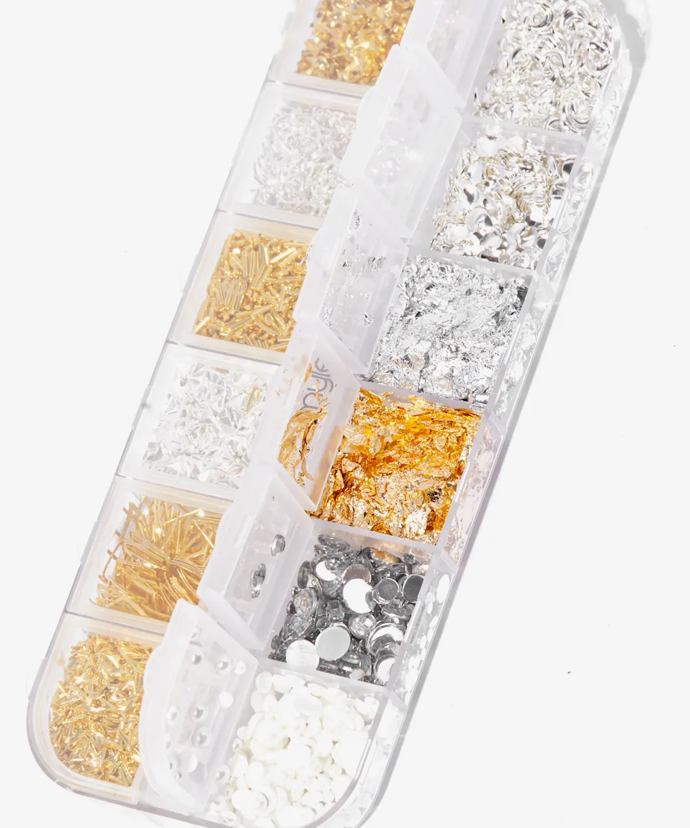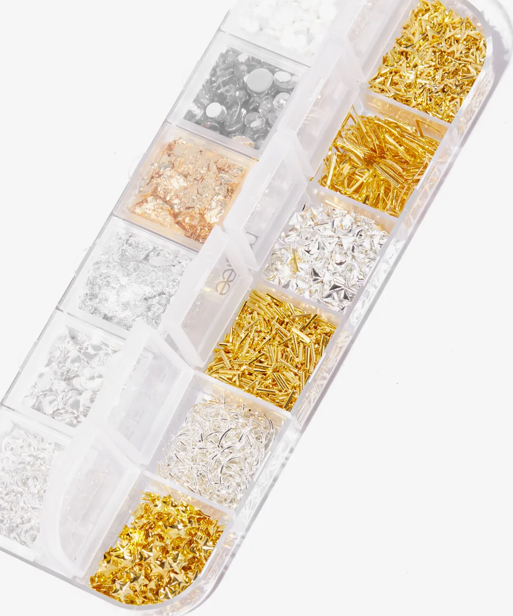 - 12 زخرفة لفن الأظافر متنوعة من الذهب والفضة.