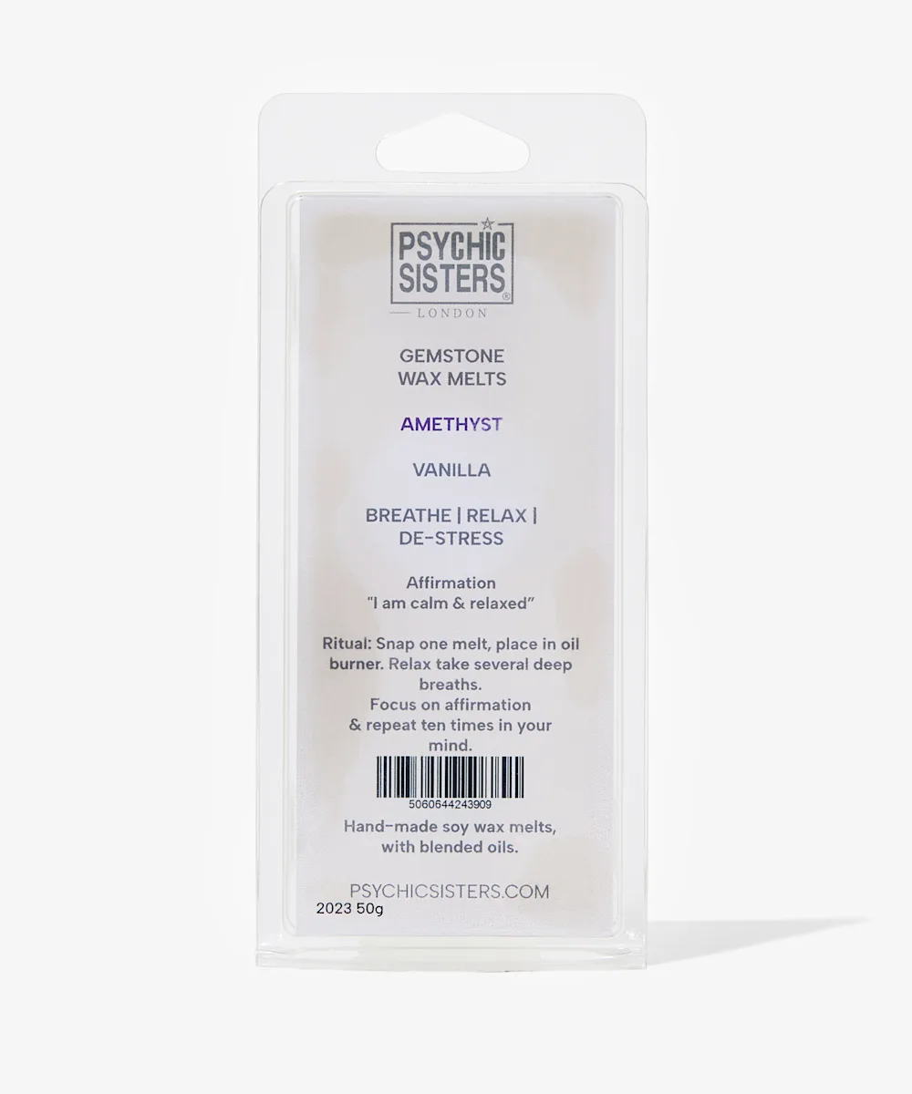 Embrace good vibes by hauling Psychic Sisters’ Gemstone Wax Melt in Amethyst. Reiki cleansed and cleared, these hand-blended soy wax melts are infused with pure essential oils for 15 hours of relaxing, room-filling fragrance. Scented with vanilla-blended soy oils, these wax melts feature amethyst crystal chips to help awaken your psychic abilities and calm and relieve mental stress for a clearer mind.