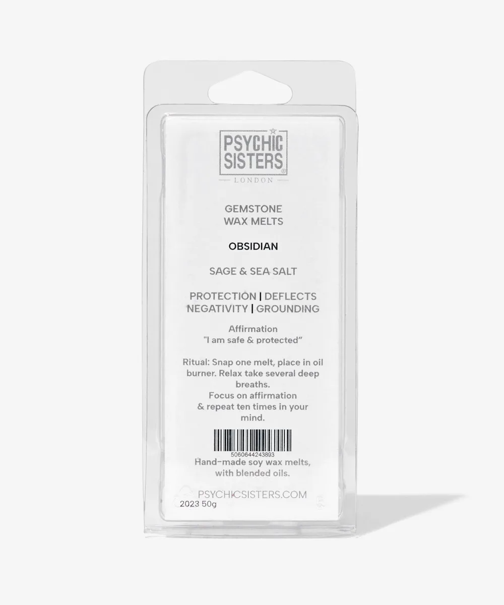 Embrace good vibes by hauling Psychic Sisters’ Gemstone Wax Melt in Black Obsidian. Reiki cleansed and cleared, these hand-blended soy wax melts are infused with pure essential oils for 15 hours of relaxing, room-filling fragrance. Scented with sage and sea salt blended oil, these wax melts feature black obsidian crystal chips to help deflect negative energy, bring protection and healing, and ward off unwanted thoughts and outside forces.