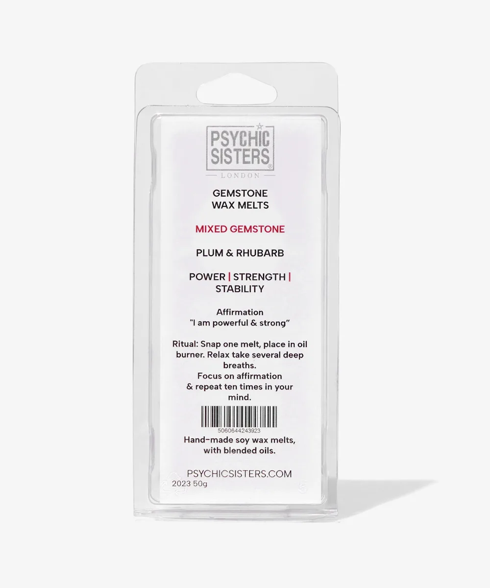 Embrace good vibes by hauling Psychic Sisters’ Gemstone Wax Melt in Mixed. Reiki cleansed and cleared, these hand-blended soy wax melts are infused with pure essential oils for 15 hours of relaxing, room-filling fragrance. Scented with plum and rhubarb blended oils, these wax melts feature mixed gemstone crystal chips to help cleanse and clear negatives and aid in reconciling and balancing opposing energies.