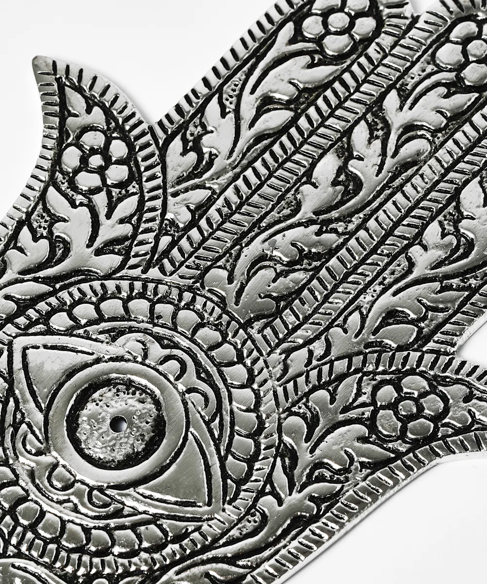 أظهري أعواد البخور بأناقة مع حامل البخور Hamsa hand Incense Holder from Psychic Sisters. مع شكل يد فريد من نوعه ، منقوش بتصميم معقد جميل بلمسة نهائية فضية عتيقة.