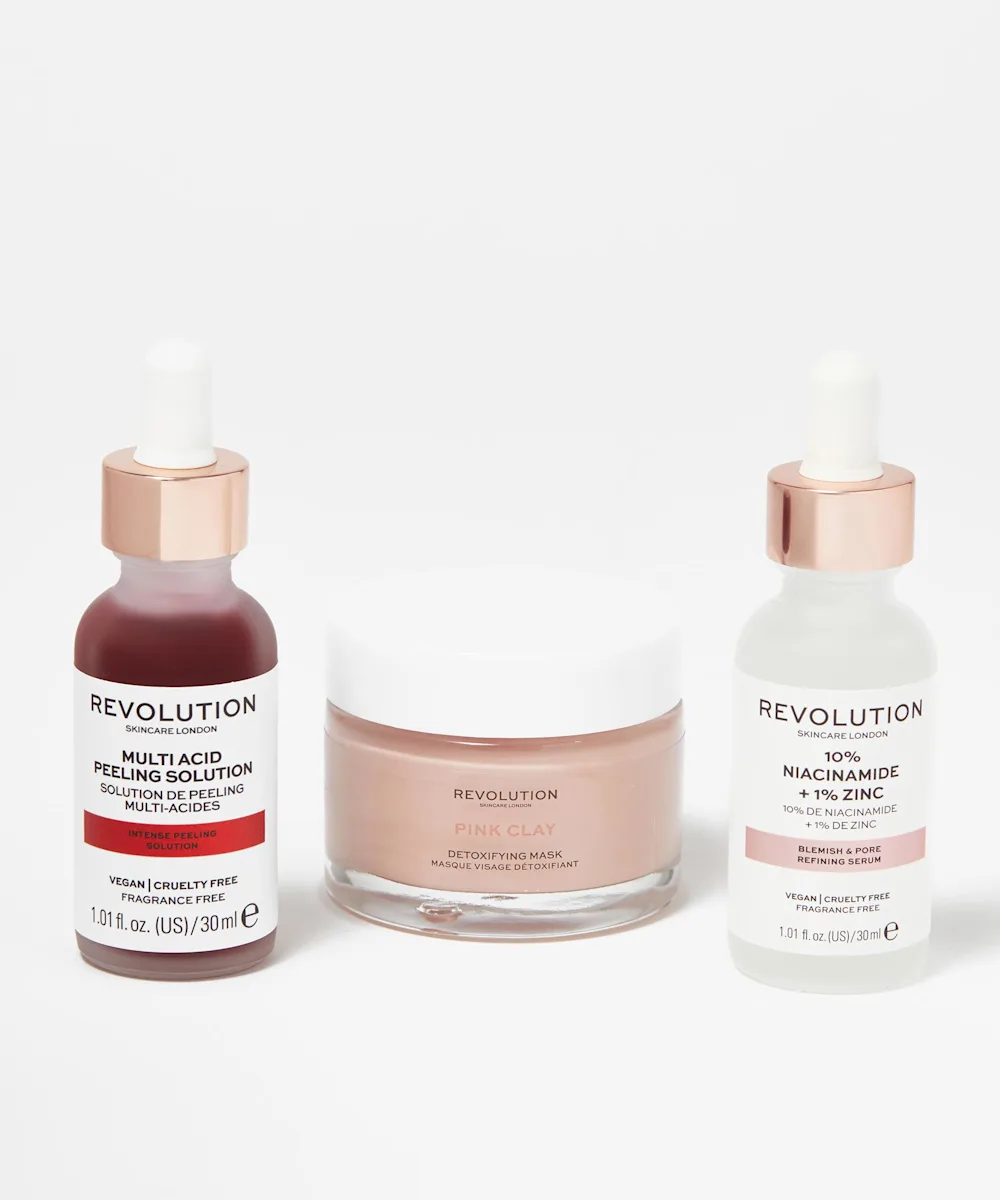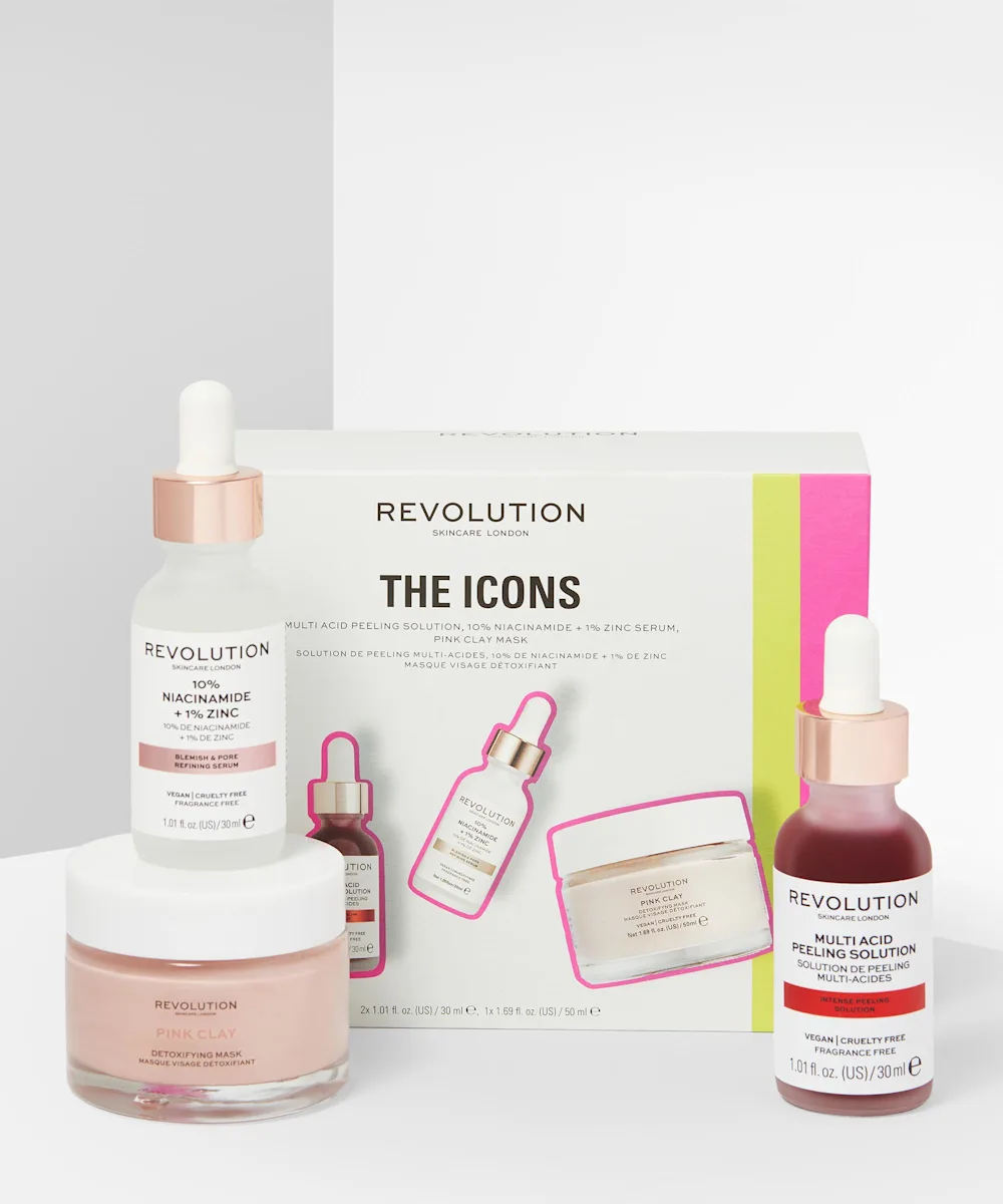 دللي نفسك أو شخص مميز بالنسبة لك بمجموعة The Icons Collection من Revolution Skincare ، وهي مجموعة من الأساسيات لتهدئة وترطيب وتقشير بشرتك. ستجدين في الداخل ماسك للوجه من الطين الوردي ، يستهدف ترطيب وتهدئة المناطق التي تعاني من مشاكل ، وسيروم النياسيناميد لمعالجة الشوائب والمسام الكبيرة ، بالإضافة إلى سيروم تقشير AHA و BHA ، الذي يقشر خلايا الجلد الميتة ليمنحك بشرة منتعشة وملساء.