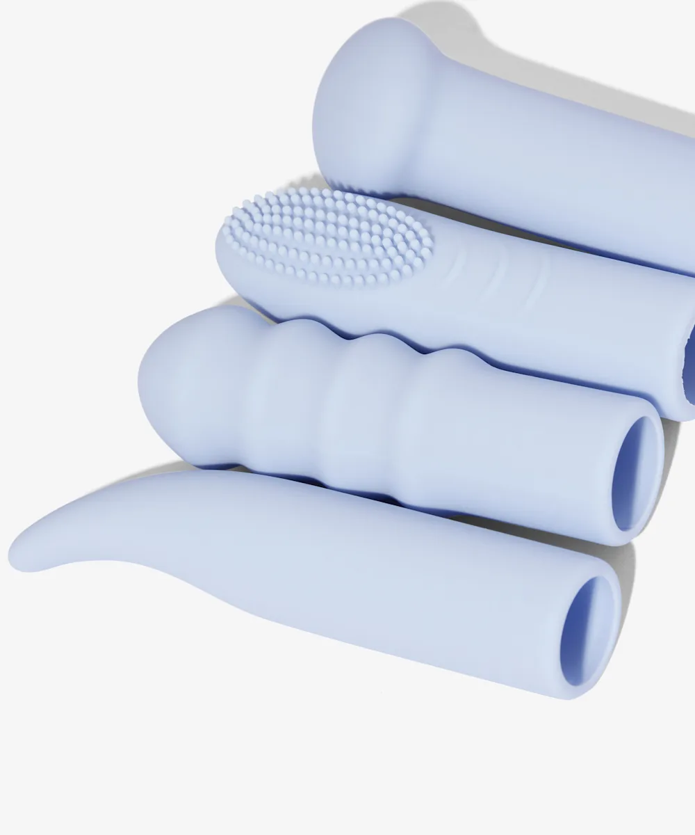 Ein 5-teiliges Set mit Selbstbefriedigungsutensilien, einschließlich eines kugelförmigen Vibrators und vier austauschbaren strukturierten Überzügen.