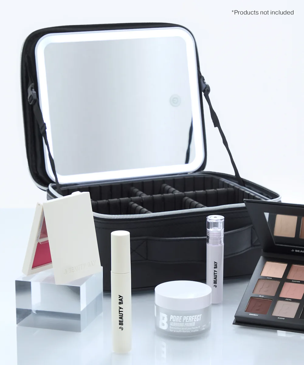Verbessere deine Beauty-Routine für unterwegs mit dem Beautycase von By BEAUTY BAY. Dieses stylische, strukturierte Case hat herausnehmbare Trenner, damit du deine Beauty-Produkte ganz nach Lust und Laune ordnen kannst. Der Deckel lässt sich dank der verstellbaren Innenriemen aufstellen, und der LED-Spiegel ist abnehmbar und wiederaufladbar. Gefertigt aus schwarzem PU mit goldfarbenen Applikationen sorgt es für ein stilvolles Upgrade auf deiner nächsten Reise.