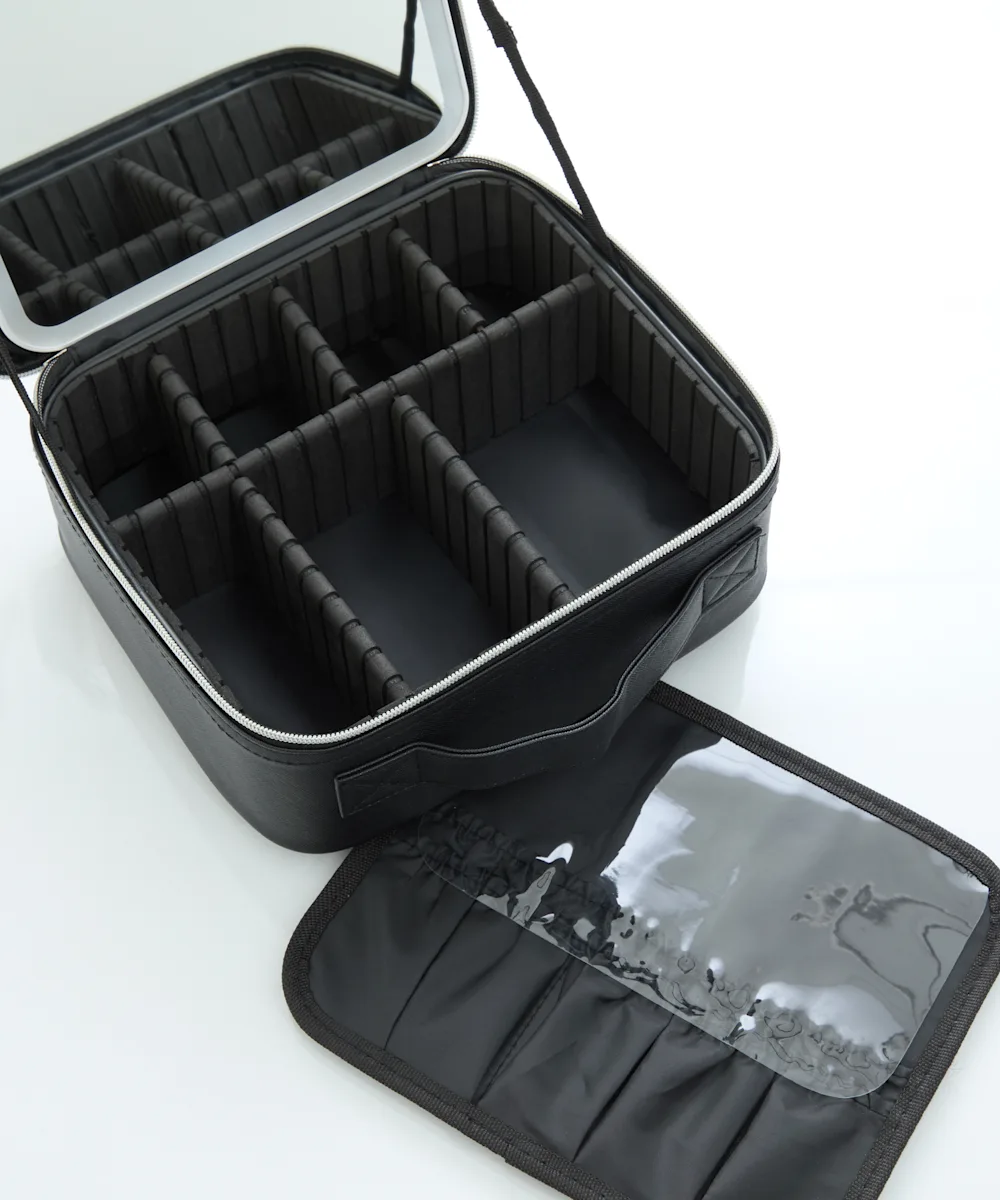 Eine großes, strukturiertes Beauty Case mit abnehmbarem LED-Spiegel, ideal zum Aufbewahren und Organisieren deiner Make-up-Essentials.