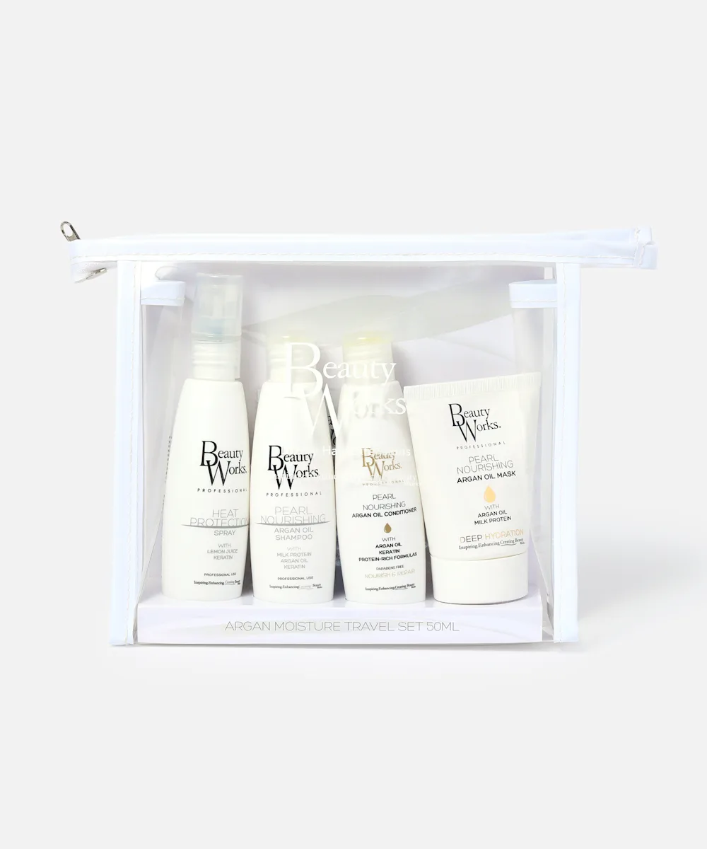 Mit dem Beauty Works Argan Moisture Repair Gift Set kannst du andere mit tollen Haaren beglücken. Dieses Set wurde speziell entwickelt, um die Haltbarkeit und Leistungskraft von Extensions zu verlängern. Es enthält fünf ikonische Haarpflegeprodukte in Reisegröße, die eine Mischung aus Arganöl und Milcheiweiß enthalten, die jede Strähne tiefgehend pflegen.