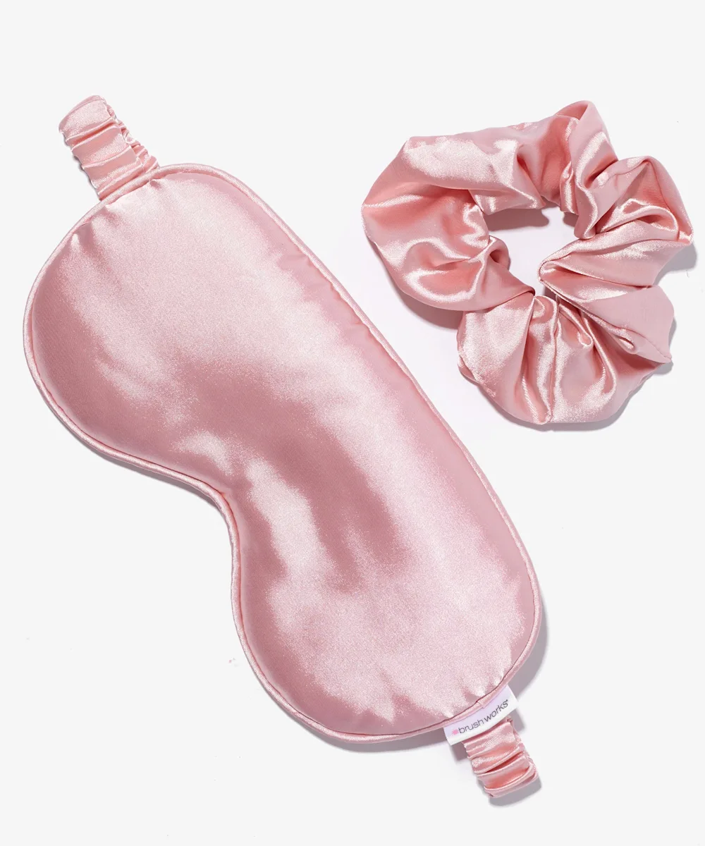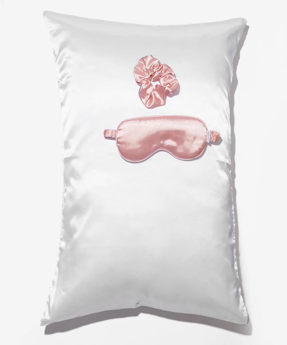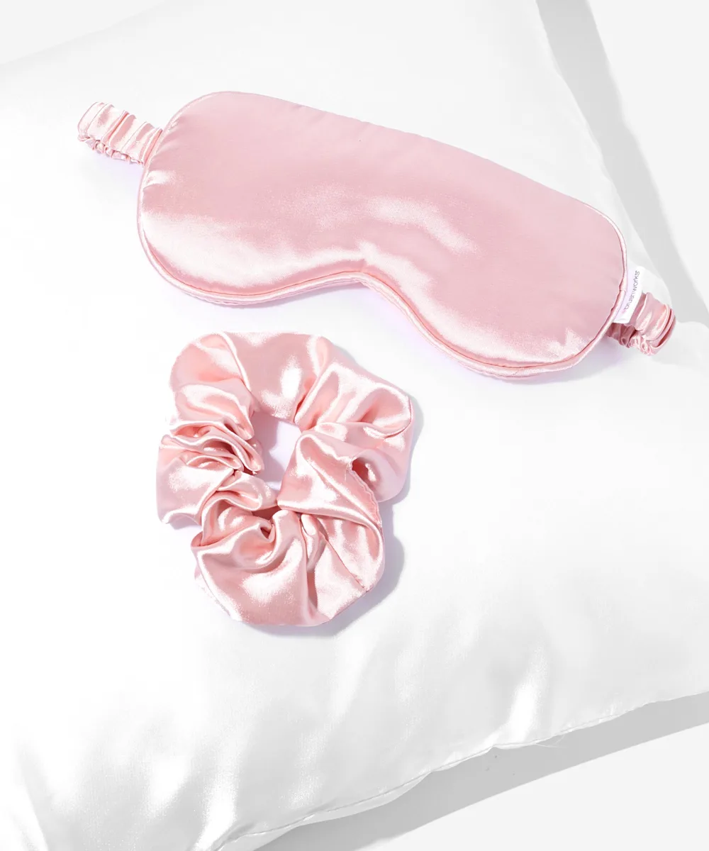 Ein Kopfkissenbezug, eine Augenmaske und ein Scrunchie aus Satin im Set.