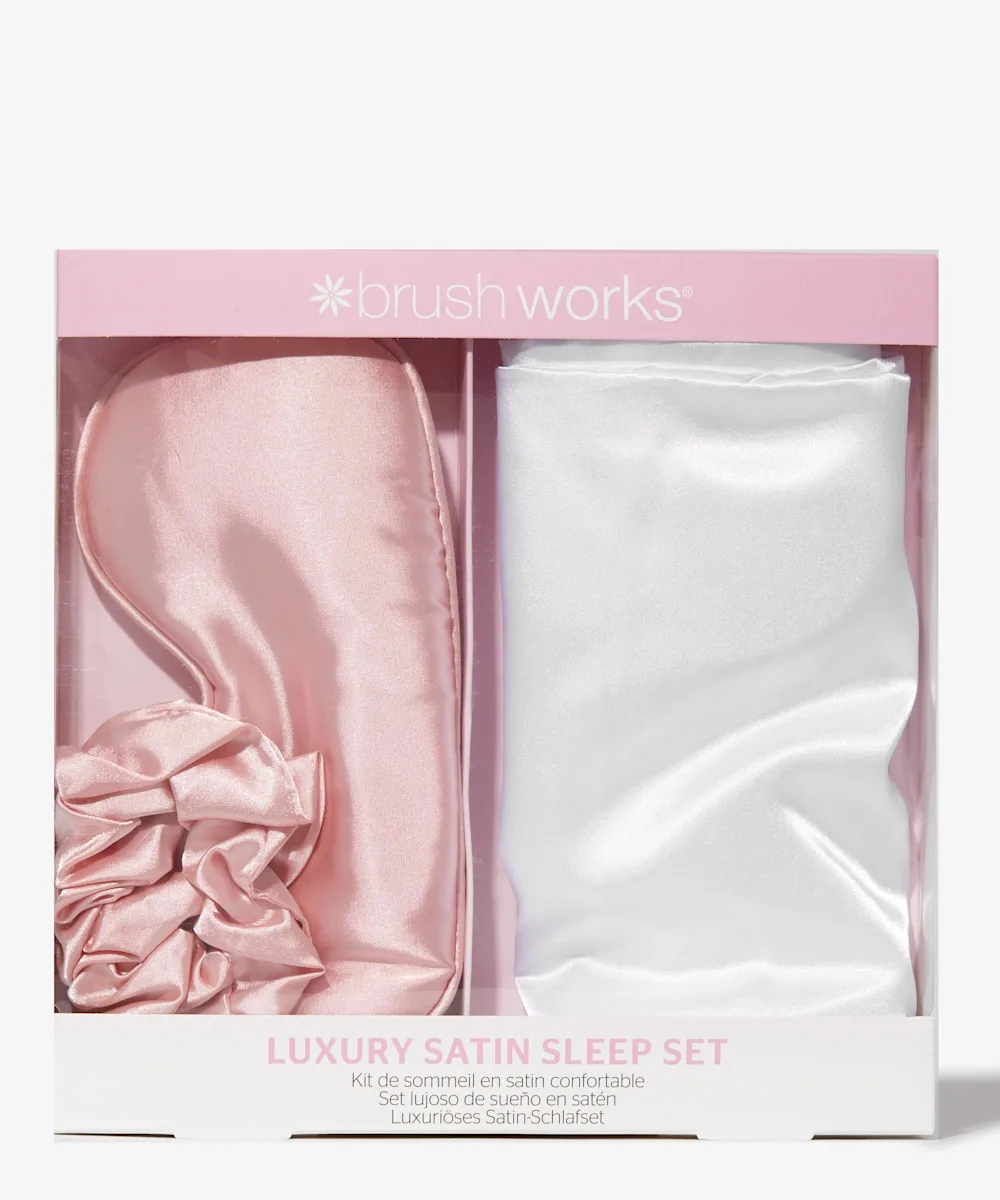 Hol dir alles für den Schönheitsschlaf – mit dem Luxury Satin Sleep-Set von Brushworks. Das Set umfasst einen edlen, seidigen Kissenbezug aus Satin, der deine Haut mit Feuchtigkeit versorgt und dein Haar im Schlaf entwirrt, eine Augenmaske aus Satin mit einem elastischen Band für einen bequemen Sitz und ein sanfter Scrunchie aus Satin, mit dem du dein Haar zurückbinden kannst, ohne das Knoten entstehen.