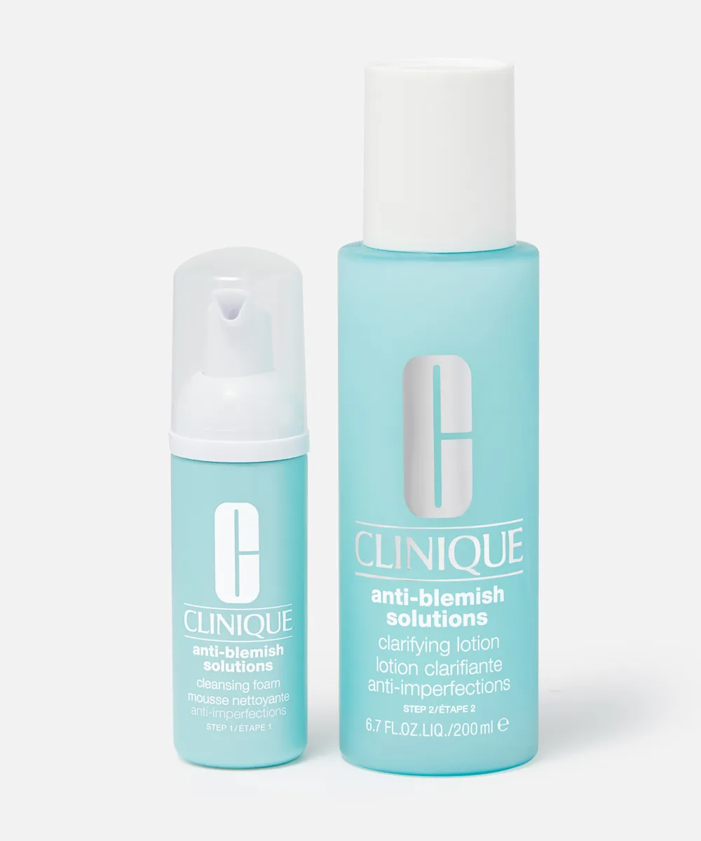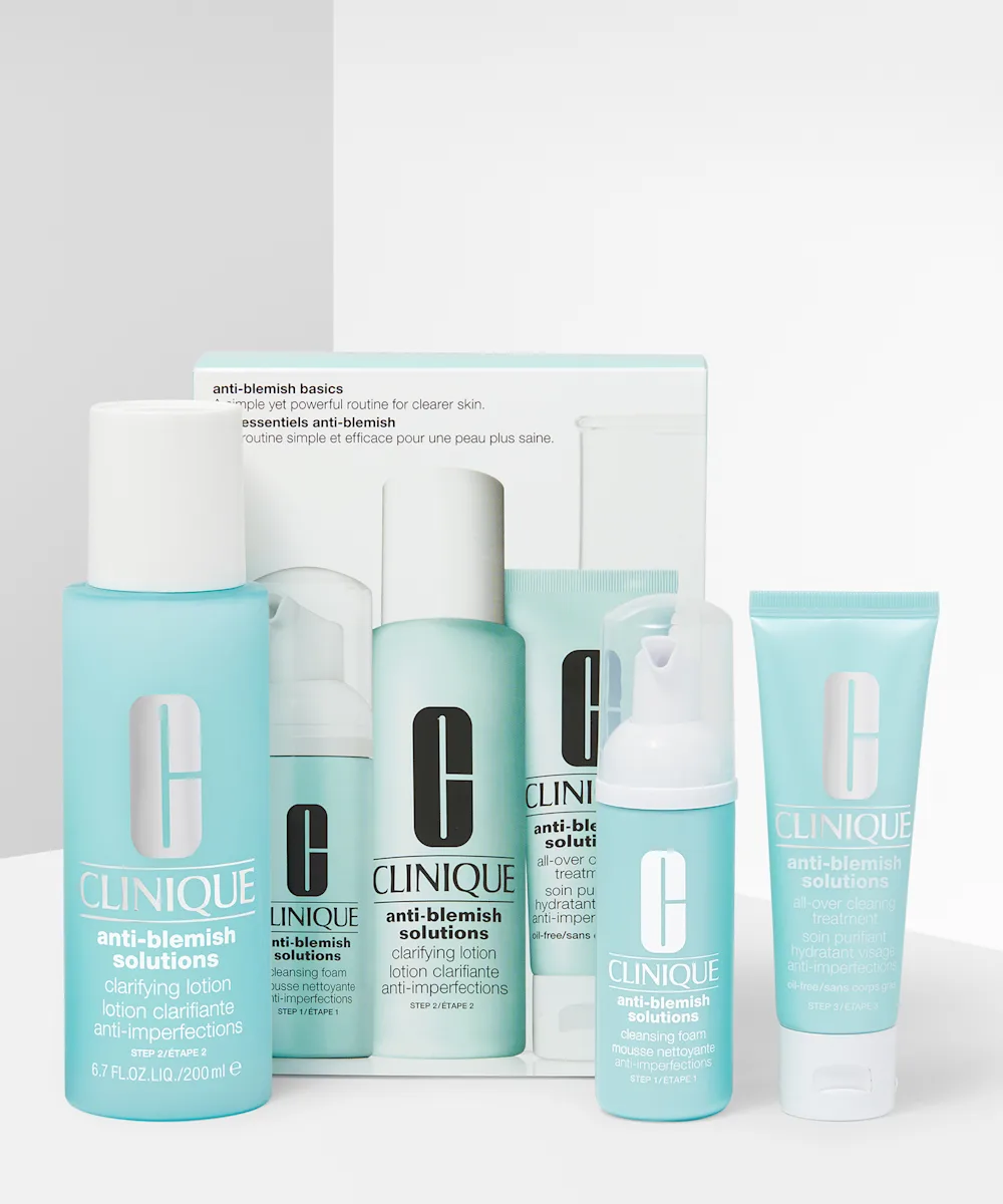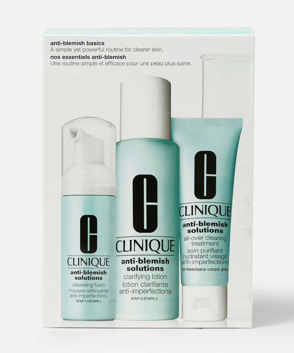 Verabschiede dich von Pickeln und halte deine Haut mit dem Anti-Pickel-Basics-Set von Clinique rein und glücklich. Dieses dreistufige Set enthält alle Mini-Produkte, die du brauchst, um die Haut zu reinigen, festigen und mit Feuchtigkeit zu versorgen. Die Formel hilft, Unreinheiten zu behandeln und verhindert gleichzeitig, dass neue entstehen. Mit dem Anti-Blemish Solutions Cleansing Foam, der die Haut reinigt, die Anti-Blemish Solutions Clarifying Lotion, die wie ein Peeling wirkt sowie dem feuchtigkeitsspendendem Anti-Blemish Solutions Clearing Treatment.