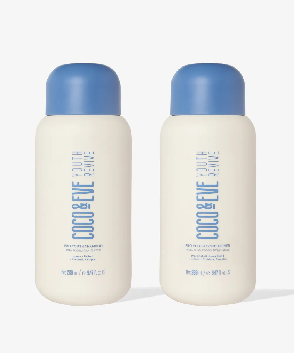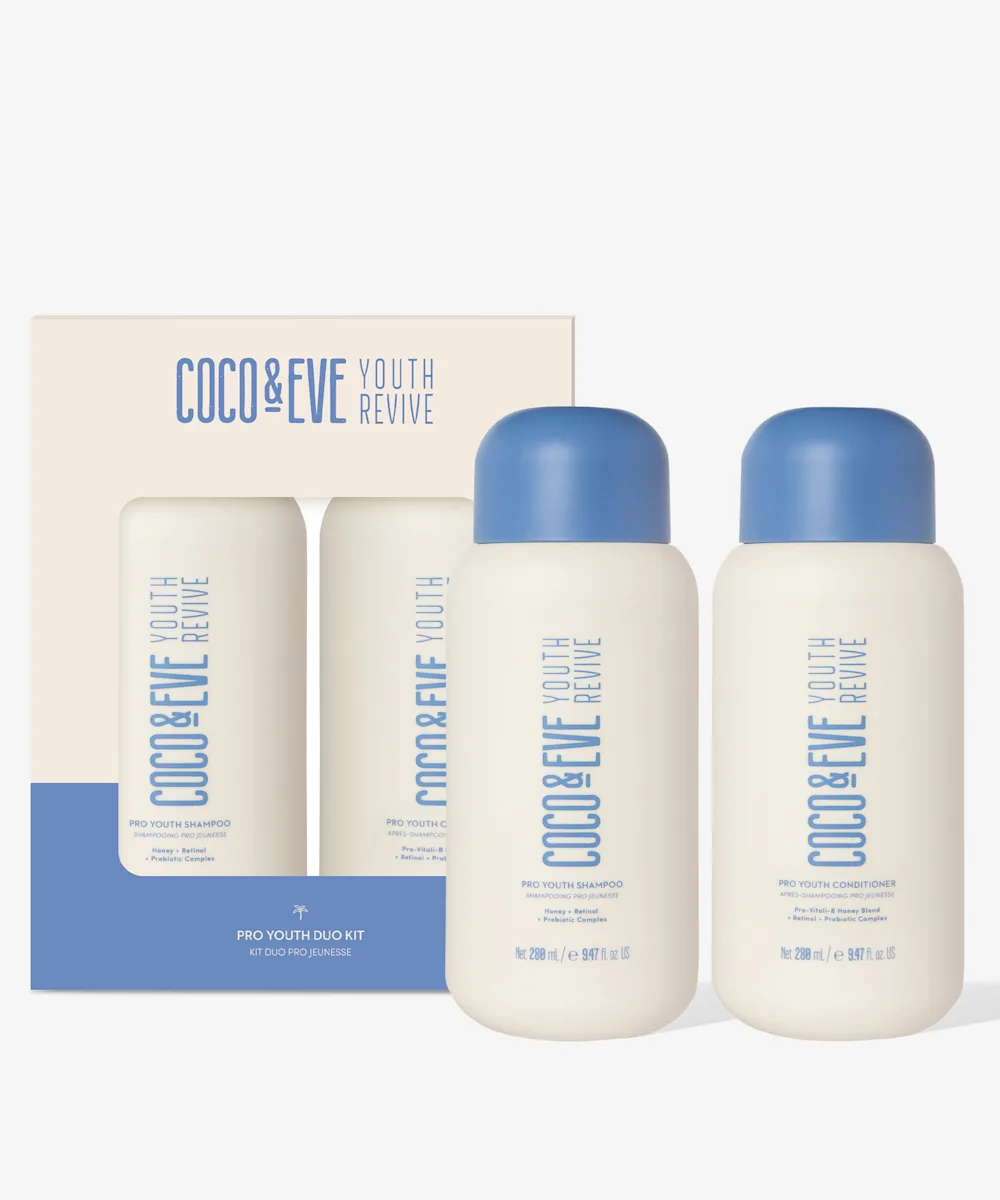 Mach dich bereit für jugendlich aussehendes Haar – mit dem Pro Youth Duo Kit von Coco & Eve. Das leistungsstarke Set mit Shampoo und Conditioner wurde entwickelt, um die drei wichtigsten Anzeichen der Haaralterung zu bekämpfen. Es verleiht deinem Haar einen Frischekick in Form von Glanz, Kraft und Volumen. Mit einem Kraftpaket aus belebenden Inhaltsstoffen wie Pro-Vitali-B™, einer Mischung aus Manuka-Honig, Propolis und Gelée Royale-Extrakt, pflegt es dein Haar und deine Kopfhaut. Ein Must-have für deine Haarpflege-Kollektion.