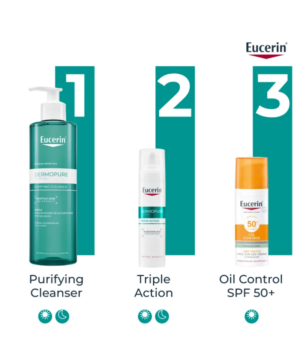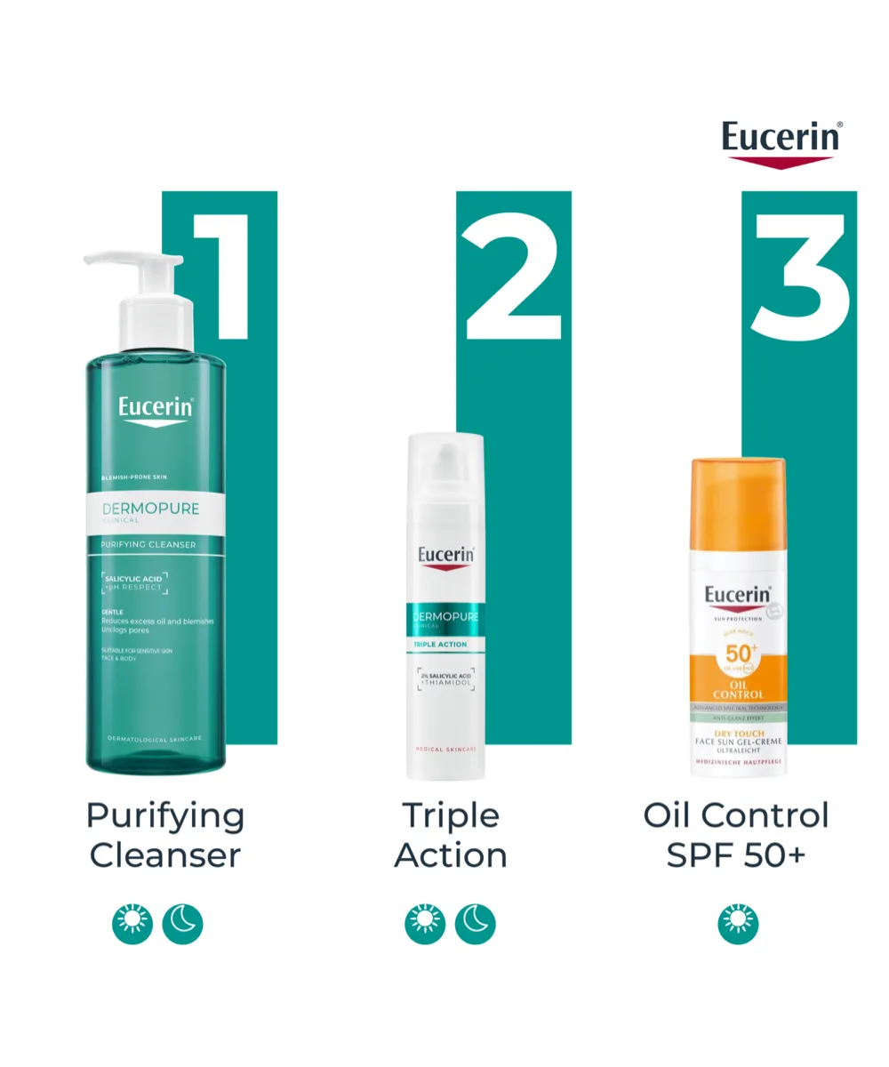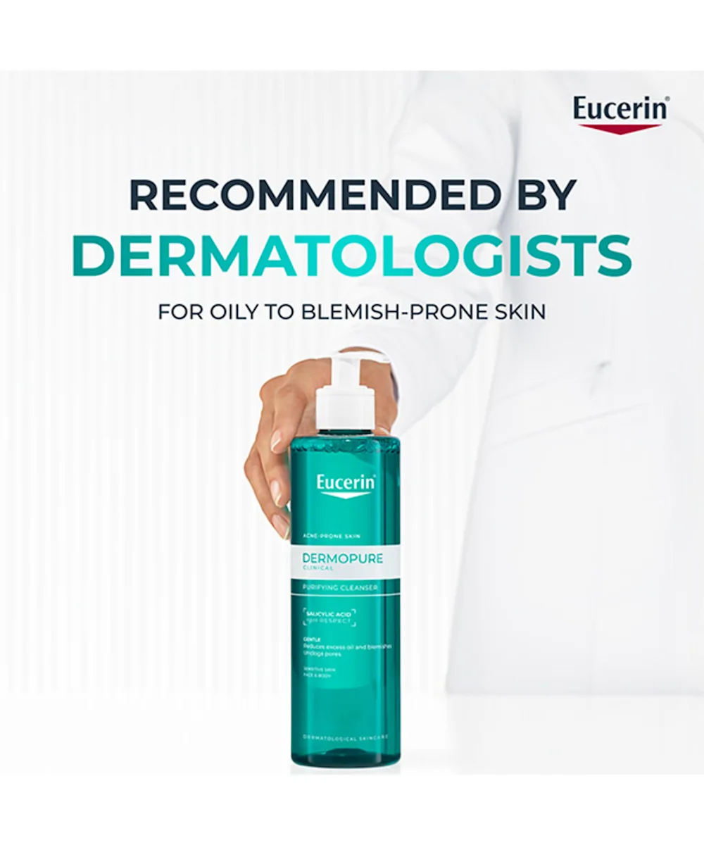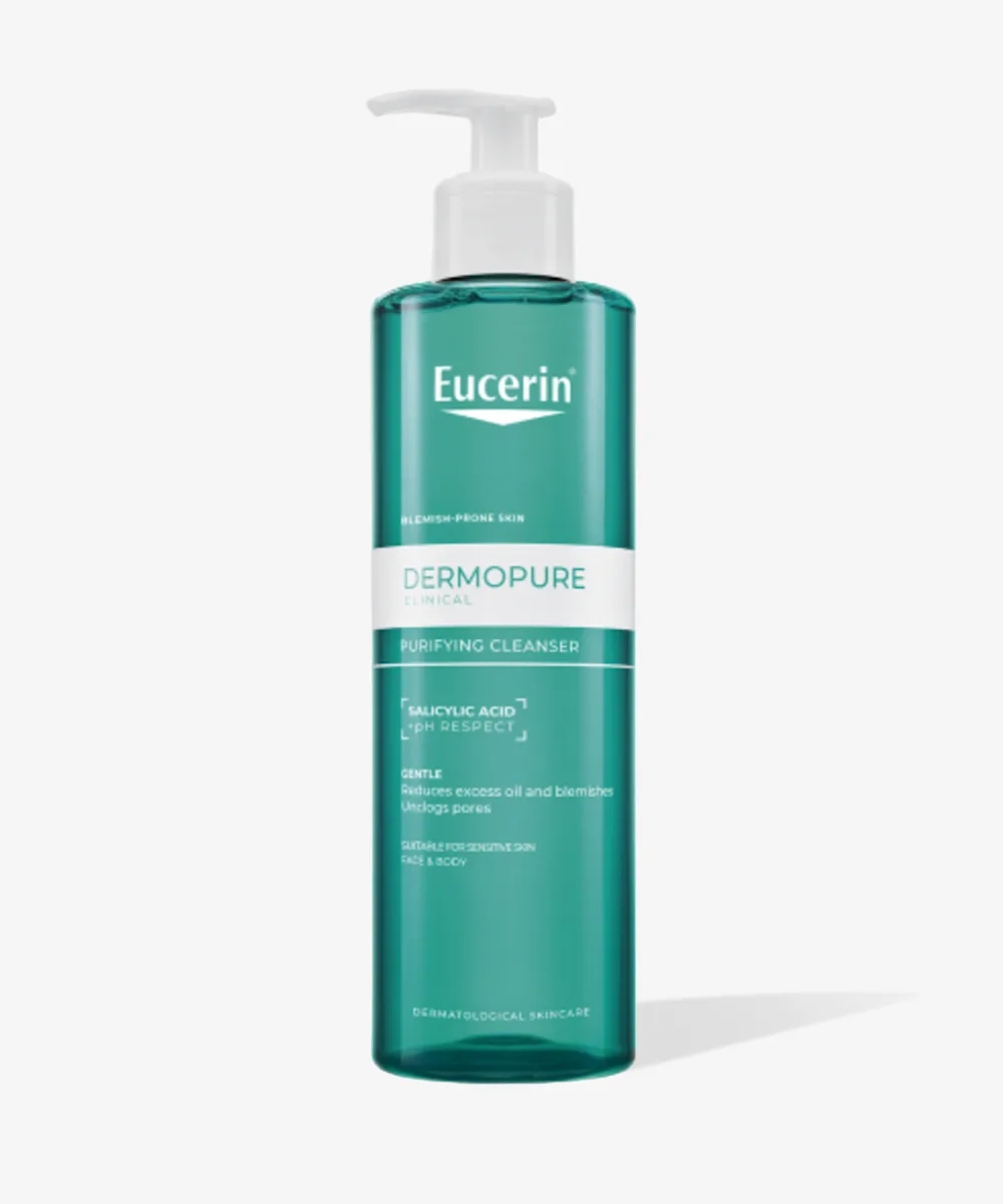 Wasch dir die Belastungen des Tages mit dem Reinigungsgel von Eucerin DERMOPURE CLINICAL ab. Es handelt sich um ein von Dermatologen empfohlenes, klinisch getestetes Gel, das von Anfang an speziell auf fettige, zu Unreinheiten neigende Haut abgestimmt ist. Mit Salicylsäure zur Reinigung der Poren und zum sanften Peelen sowie AHA und PHA für eine glatte Hautstruktur und einen ebenmäßigen Teint sorgt dieses Produkt mit nur 8 hautfreundlichen Inhaltsstoffen für kraftvolle Ergebnisse. Dieser Reiniger entfernt überschüssigen Talg, Schmutz und Unreinheiten, ohne die Haut auszutrocknen. Er bewahrt den natürlichen Feuchtigkeitshaushalt der Haut und hinterlässt ein frisches, klares und ausgeglichenes Hautgefühl. Ein unverzichtbarer Schritt in der täglichen Pflege bei Akne oder hartnäckigen Hautunreinheiten.