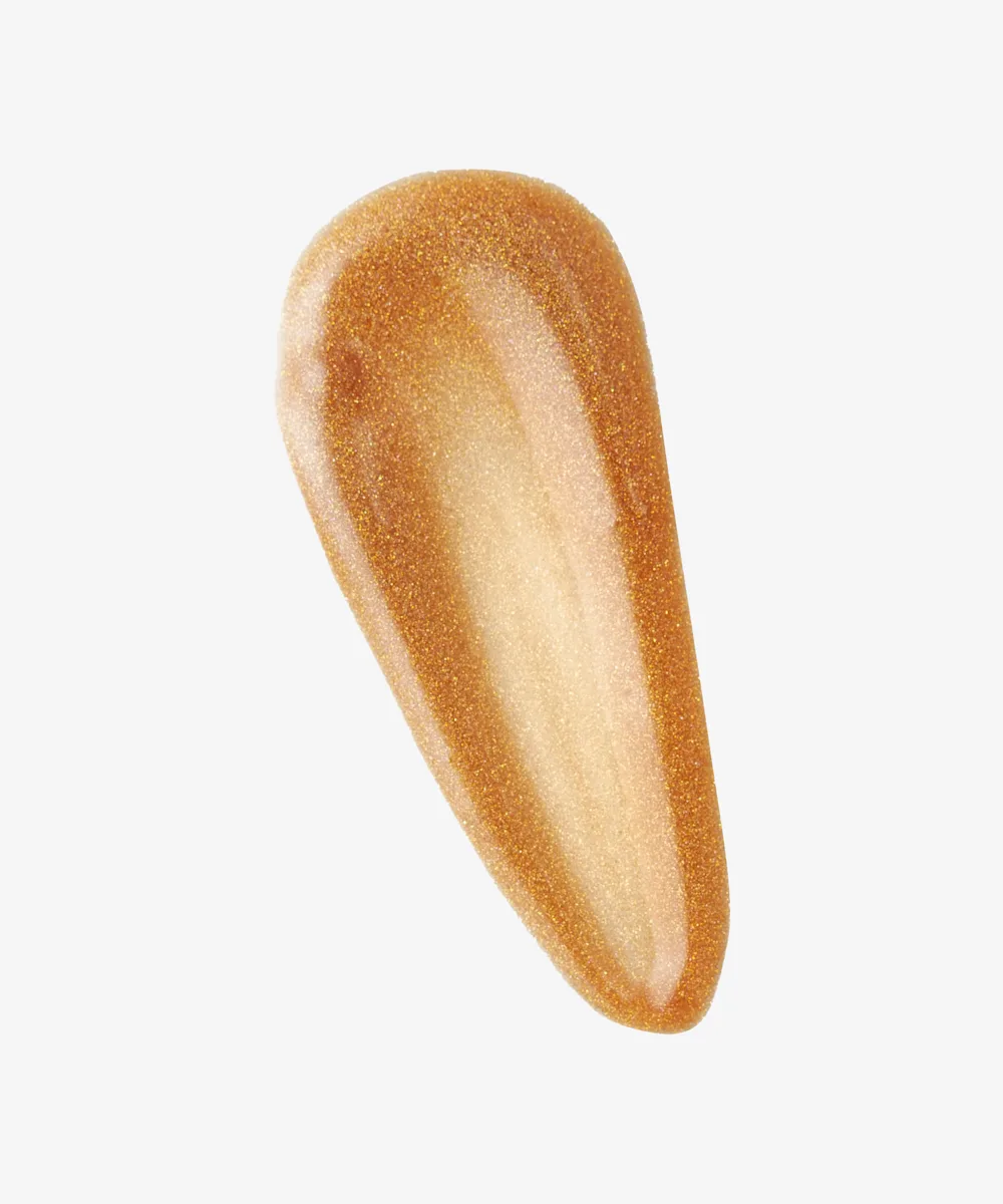 Ein Sonnenschutzmittel mit LSF 50+ in öliger Gelform mit einem goldfarbenen Schimmer.