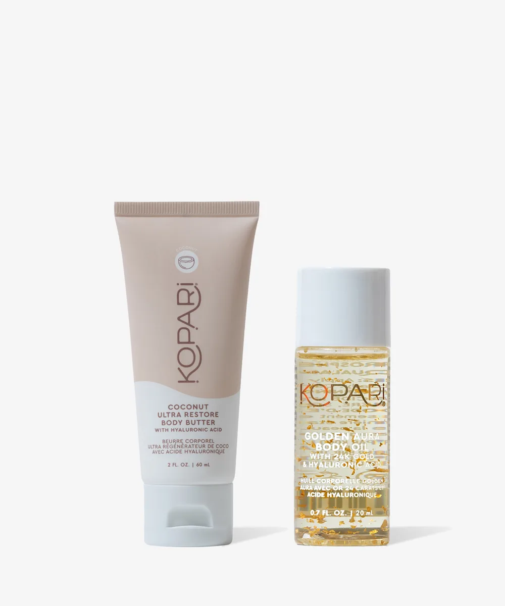 Verwöhne deine Haut mit Feuchtigkeit mit dem Kopari Beauty Hydration Hideaway. Dieses dynamische Duo enthält alles, was du brauchst, um die Haut mit Feuchtigkeit zu versorgen, zu regenerieren, zu besänftigen, zu glätten und zu erweichen. Es besteht aus der Ultra Restore Körperbutter und dem Golden Aura Körperöl. Dein Körperpflege-Routine hat gerade ein Mega-Upgrade erhalten.