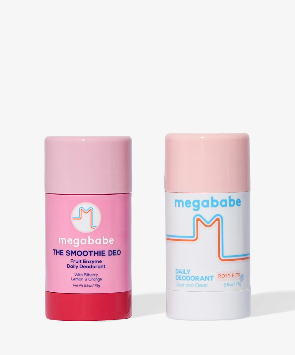 Grubenabschied vom Körpergeruch mit dem Megababe Pit Perfect Duo. Im Inneren finden Sie zwei BO-battling Deodorants, darunter das Rosy Pits Daily Deodorant, ein feuchtigkeitsspendendes Deodorant mit Rosenduft, und das Smoothie Deo Fruit Enzyme Daily Deodorant, ein natürlicher, einfach zu verwendender Deo-Stick.