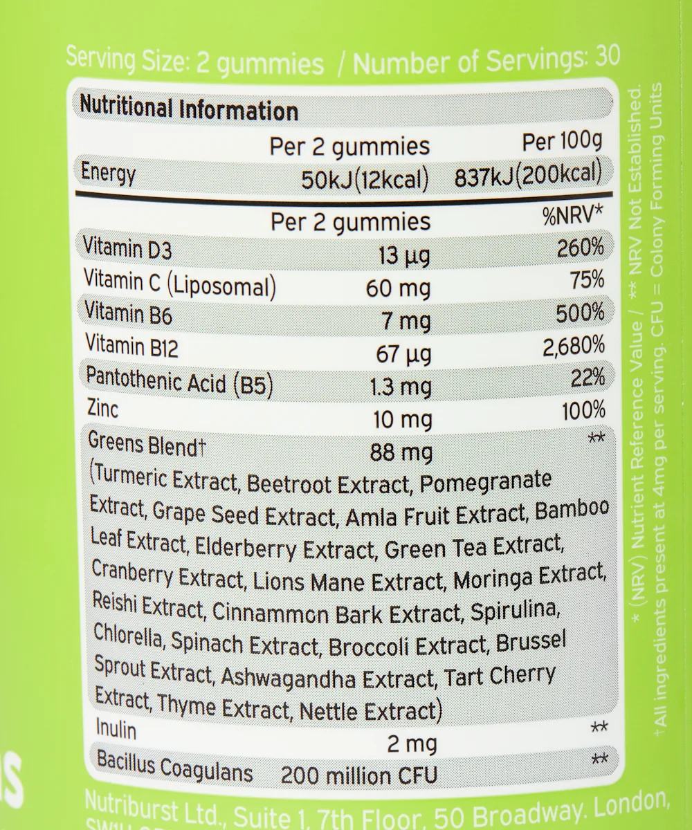 Sweeteners (Maltitol, lsomalt), Water, Gelling Agent (Pectin), Acidity Regulators (Citric Acid, Sodium Citrate), Liposomal Vitamin C (Vegetable Oil, Cocoa Butter, Isomaltose Syrup, Buffer Salt, Ascorbic Acid), Natural Flavour, Zinc Citrate, Vitamin D3 (Cholecalciferol), Pyridoxine HCl, Turmeric Extract, Beetroot Extract, Pomegranate Extract, Grape Seed Extract, Amla Fruit Extract, Bamboo Leaf Extract, Elderberry Extract, Green Tea Extract, Cranberry Extract, Lions Mane Extract, Moringa Extract, Reishi Extract, Cinnammon Bark Extract, Spirulina, Chlorella, Spinach Extract, Broccoli Extract, Brussel Sprout Extract, Ashwagandha Extract, Tart Cherry Extract, Thyme Extract, Nettle Extract, Inulin, Bacillus Coagulans, Calcium D-Pantothenate, Colouring Food (Apple Extract), Vegetable Oil (Coconut Oil, Glazing Agent [Carnauba Wax]), Vitamin B12 (Methylcobalamin), Sweetener (Steviol Glycosides from Stevia) *Nutrient Reference Value **NRV Not Established †All ingredients present at 4mg per serving CFU = Colony Forming Units