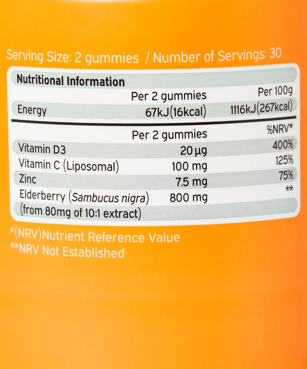 Sweeteners (Maltitol, Isomalt), Water, Liposomal Vitamin C (Vegetable Oil, Cocoa Butter, Isomaltose Syrup, Buffer Salt, Ascorbic Acid), Elderberry (Sambucus nigra) 10:1 Extract, Gelling Agent (Pectin), Acidity Regulators (Citric Acid, Sodium Citrate), Natural Flavourings, Zinc Citrate, Colouring Food (Black Carrot Extract), Vegetable Oil (Coconut Oil, Glazing Agent [Carnauba Wax]), Sweetener (Steviol Glycosides from Stevia), Vitamin D3 (Cholecalciferol).*Nutrient Reference Value **NRV Not Established