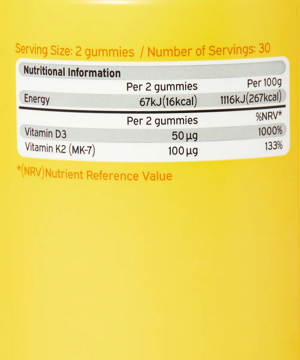 Sweeteners (Maltitol, Isomalt), Water, Gelling Agent (Pectin), Acidity Regulators (Citric Acid, Sodium Citrate), Natural Flavourings, Vitamin K2 (Menaquinone-7), Vitamin D3 (Cholecalciferol), Colouring Food (Lemon Extract), Vegetable Oil (Coconut Oil, Glazing Agent [Carnauba Wax]), Sweetener (Steviol Glycosides from Stevia) *Nutrient Reference Value