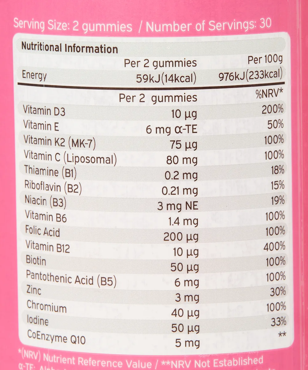 Sweeteners (Maltitol, lsomalt), Water, Gelling Agent (Pectin), Liposomal Vitamin C (Vegetable Oil, Cocoa Butter, Isomaltose Syrup, Buffer Salt, Ascorbic Acid), Acidity Regulators (Citric Acid, Sodium Citrate), Natural Flavourings, Calcium D-Pantothenate, Vitamin E (D-Alpha Tocopheryl Succinate), CoEnzyme Q10, Nicotinamide, Zinc Citrate, Pyridoxine HCl, Riboflavin, Folic Acid, Thiamine HCl, Vitamin K2 (Menaquinone-7), Colouring Food (Strawberry Extract), Vegetable Oil (Coconut Oil, Glazing Agent [Carnauba Wax]), Biotin, Potassium Iodide, Chromium Picolinate, Sweetener (Steviol Glycosides from Stevia), Vitamin B12 (Cyanocobalamin), Vitamin D3 (Cholecalciferol). *Nutrient Reference Value **NRV Not Established ⍺-TE: Alpha-tocopherol Equivalents NE: Niacin Equivalents