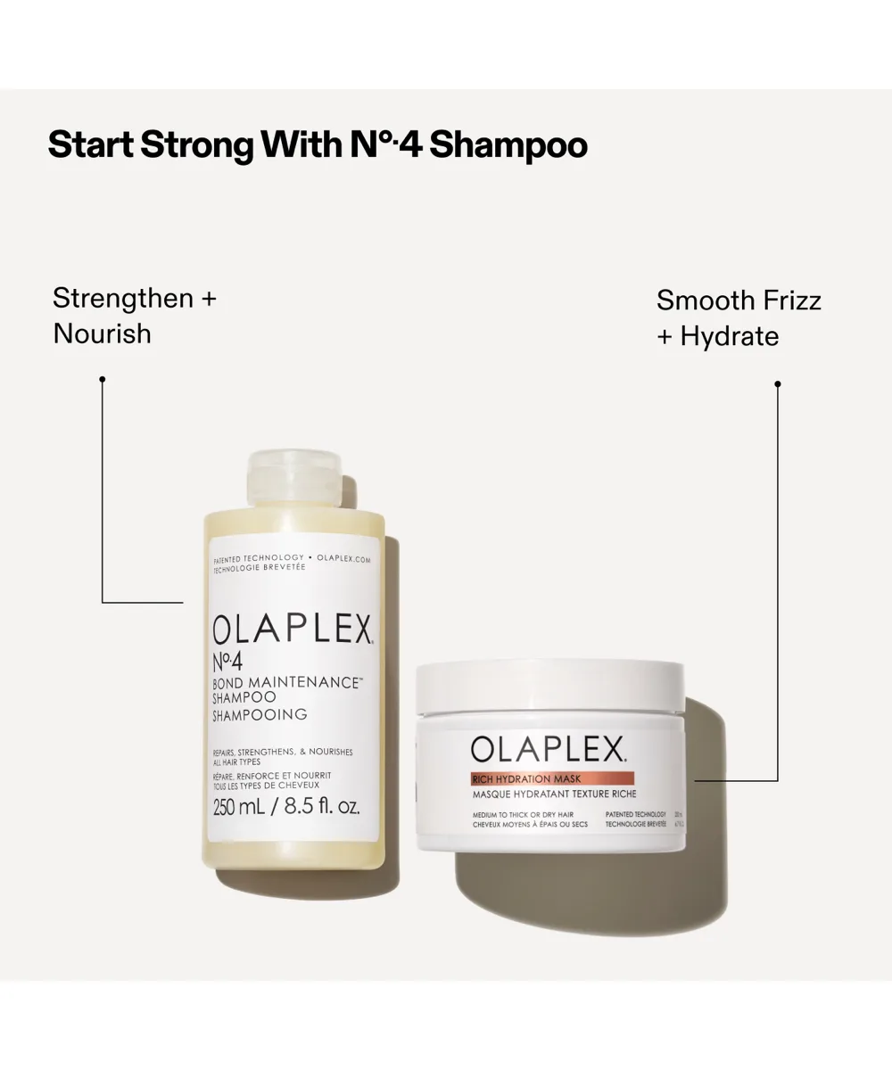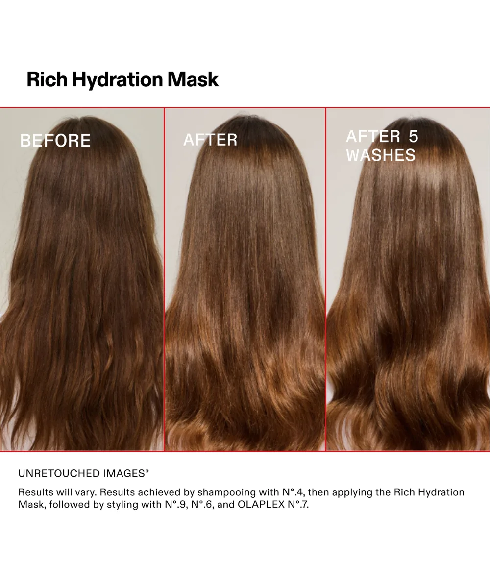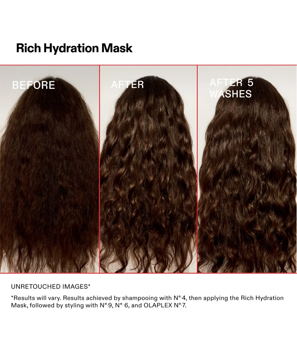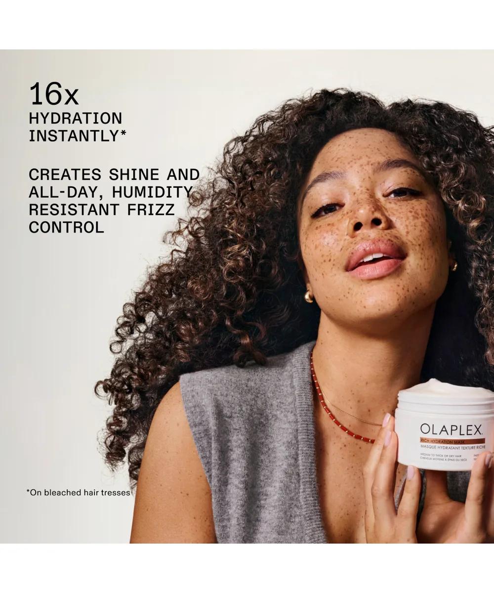 Revive dehydrated strands with the OLAPLEX Rich Hydrating Mask. Perfect for medium to coarse hair types, this intensive treatment is powered by Biomimetic Cuticle Technology to lock in lasting hydration and strength while sealing the cuticle for up to 5 washes. Delivering instant softness, shine and all-day frizz control, it also helps reduce and protect against breakage, keeping hair strong, smooth and resilient.