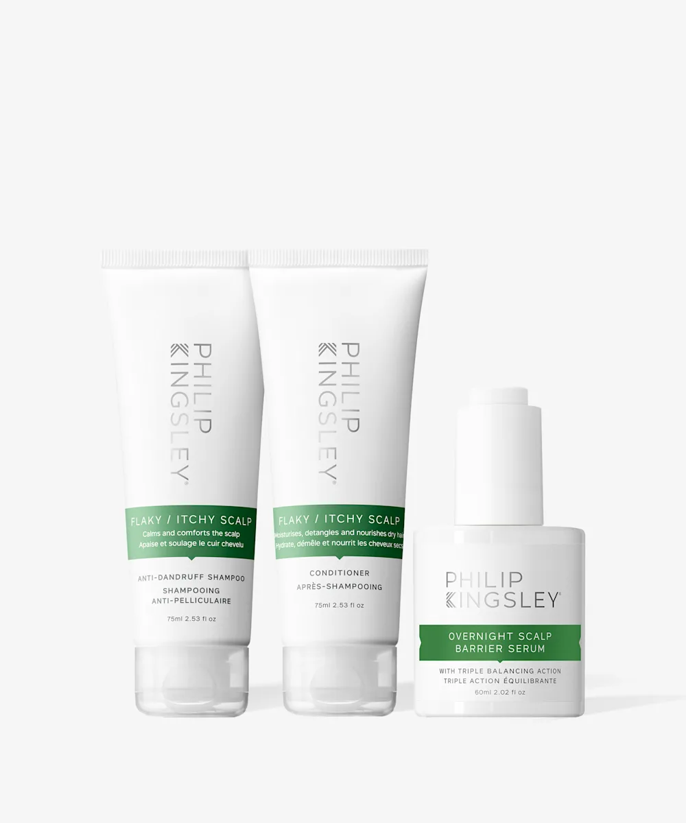 Bekämpfe Schuppen mit dem Philip Kingsley Scalp Soothing Discovery Trio. Darin findest du drei Haarpflegeprodukte, die Irritationen lindern, Schuppen und Juckreiz beseitigen. Dazu gehören das Flaky/Itchy Scalp Anti-Schuppen-Shampoo, ein beruhigendes Shampoo, der Flaky/Itchy Scalp Hydrating Conditioner, ein feuchtigkeitsspendender Conditioner und das Overnight Scalp Barrier Serum, ein Kopfhautserum für die Nacht.