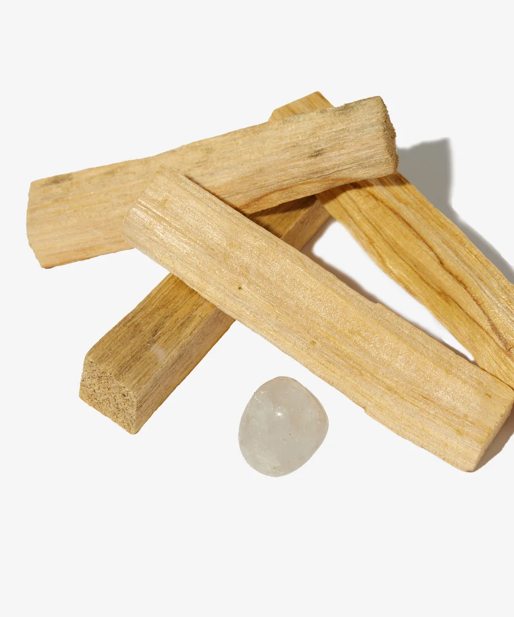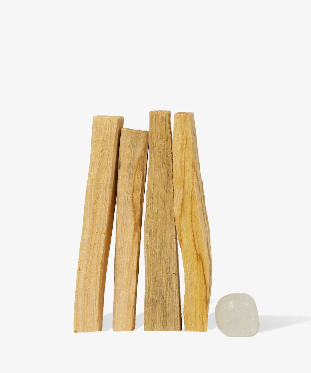 Ein Set mit vier Palo Santo-Stäbchen und einem klaren Quarzkristall