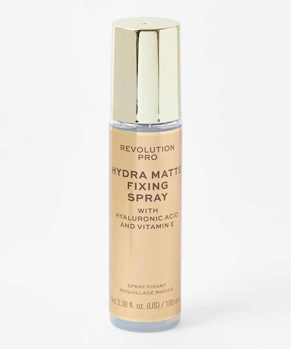 Das Hydra-Matte Fixing Spray von Revolution Pro hält Make-up dort, wo es sein soll und schenkt der Haut gleichzeitig Feuchtigkeit. Die einzigartige Formel mit Hyaluronsäure und Vitamin E mattiert die Haut und schützt sie.