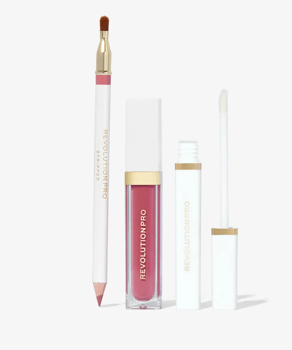 Kreiere ultimative Party-Lippen mit dem Iconic Lip Edit in Stripped von Revolution Pro. Dieses Set enthält einen hautfarbenen doppelseitigen Lipliner (mit einem Pinsel am anderen Ende), einen passenden pigmentierten flüssigen Lippenstift und einen Lipgloss-Versiegeler, die perfekte Drei-Schritte-Routine für glamouröse Lippen-Looks.