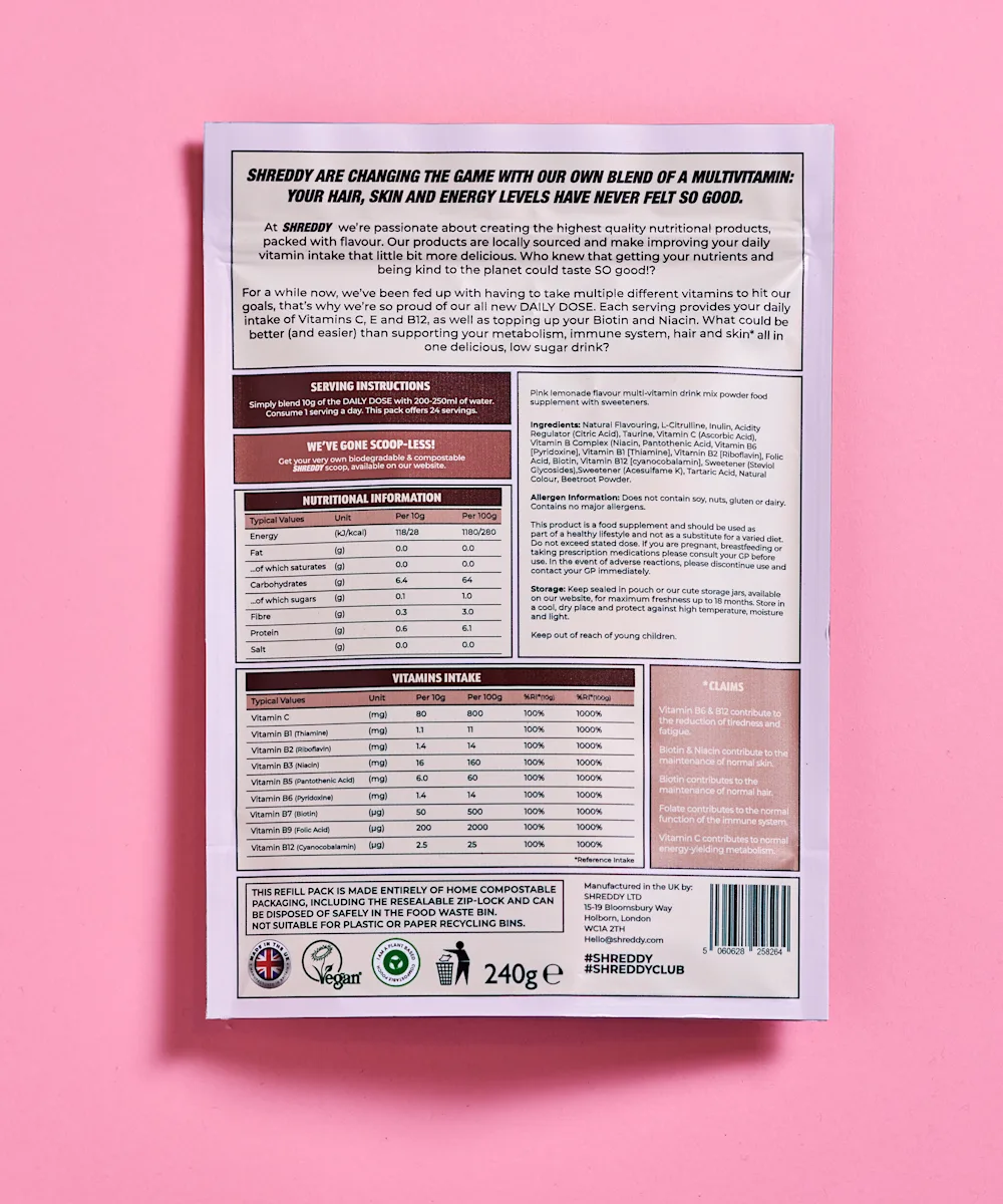 Hol dir mit der Pink Lemonade Daily Dose von Shreddy einen nährstoffreichen Boost, der auch noch hervorragend schmeckt. Dieses Ergänzungsmittel in Pulverform ist mit neun Vitaminen formuliert. Es bekämpft Müdigkeit, stärkt und gewährleistet deine Immunfunktion und unterstützt die Erhaltung von gesundem Haar und gesunder Haut. Jede Portion deckt deinen täglichen Bedarf an Vitamin C, E und B12 sowie an Biotin und Niacin, alles in einem leckeren, zuckerarmen Drink vereint. Jetzt kannst du mit Shreddy richtig loslegen.