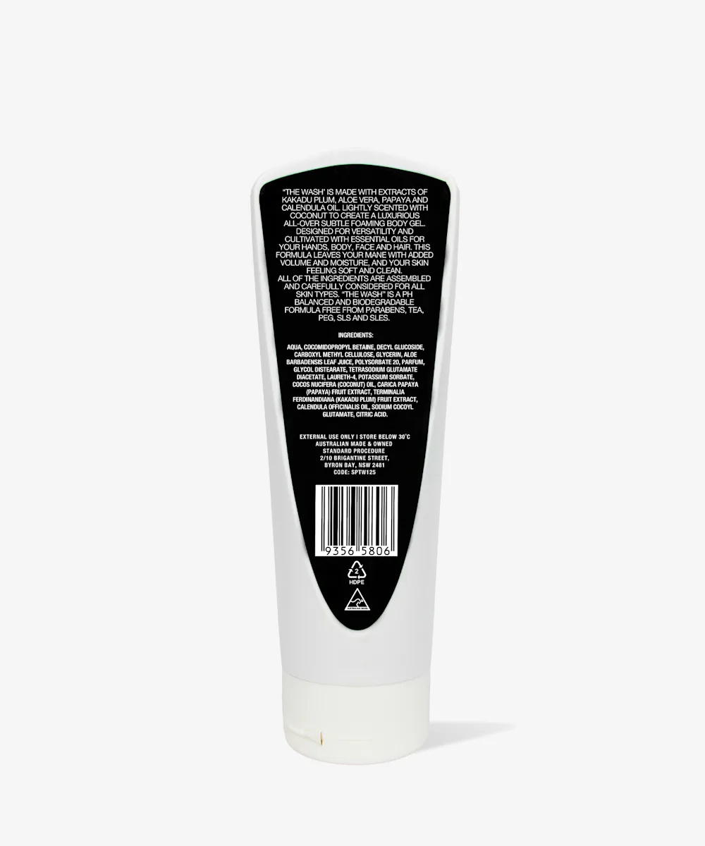 Aqua, Cocamidopropyl Betaine, Decyl Glucoside, Carboxymethyl Cellulose, Glycerin, Polysorbate 20, Aloe Barbadensis (Aloe Vera) Leaf Juice, Parfum, Glycol Distearate, Laureth-4, Cocos Nucifera (Coconut) Oil, Carica Papaya (Papaya) Fruit Extract, Terminalia Ferdinandiana (Kakadu Plum) Fruit Extract, Calendula Officinalis (Calendula) Extract, Sodium Cocoyl Glutamate, Tetrasodium Glutamate Diacetate, Phenoxyethanol, Ethylhexylglycerin, Citric Acid