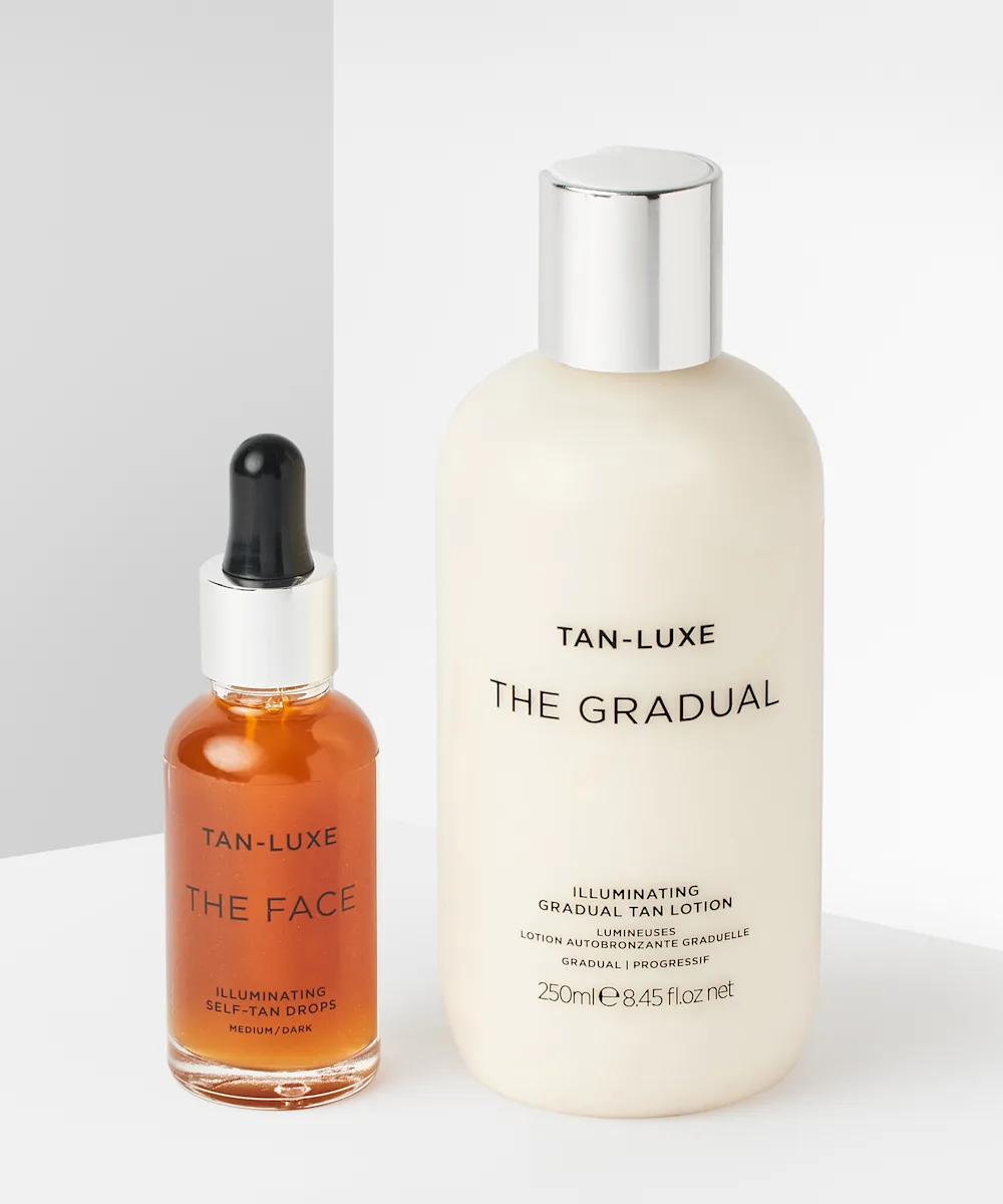 Kreiere mit diesem Duo mühelos eine strahlende, individuelle Bräune. Das Set beinhaltet die Favoriten unseres Beauty Editors: The Face und The Gradual, ein leichter Selbstbräuner, der sich allmählich entwickelt. The Face lässt sich in deine tägliche Hautpflege integrieren. Mische diese Tropfen in Feuchtigkeitscremes, Seren oder Öle und verwandle diese in Selbstbräuner, die auf deine Haut zugeschnitten sind. The Gradual fungiert als tägliche Feuchtigkeitscreme und verwöhnt dich mit einer natürlichen, aufbaubaren Bräune. Die Haut fühlt sich hydratisiert an und sieht strahlend aus, wobei Unvollkommenheiten minimiert werden.