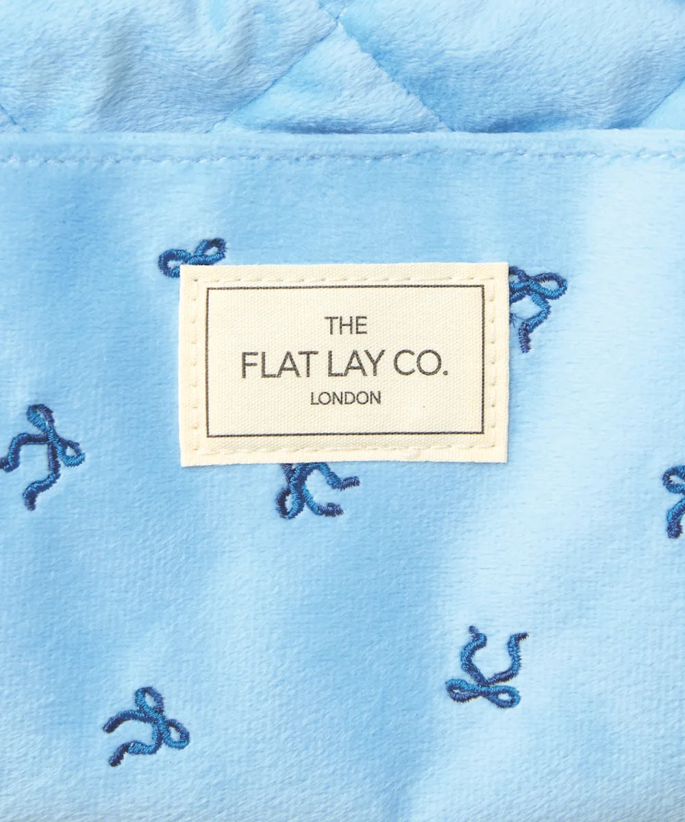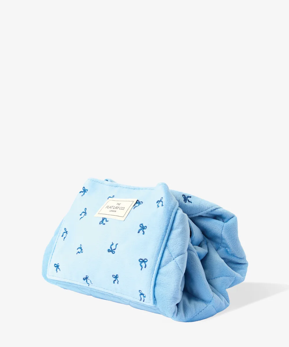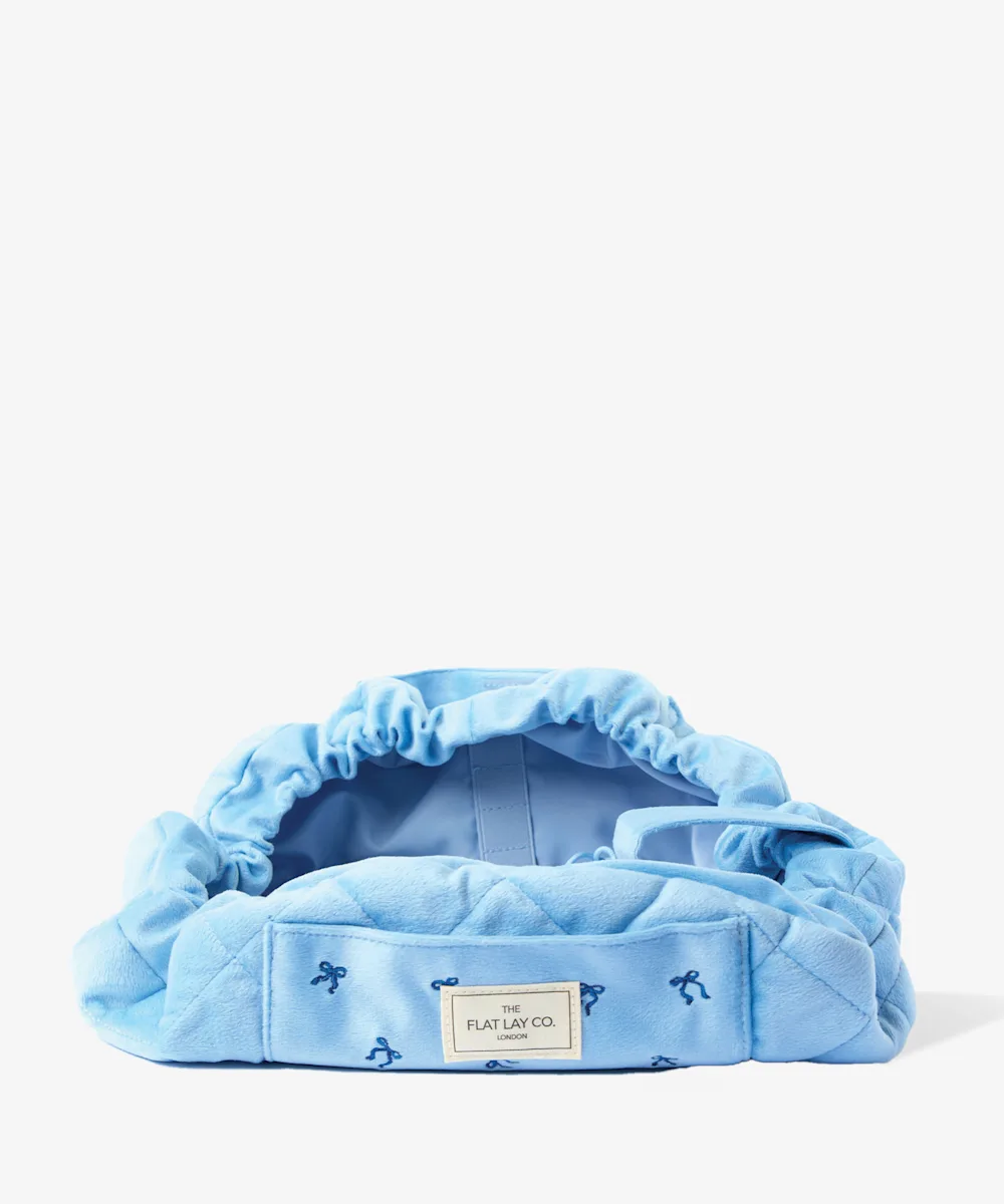 Drawstring Flat Lay Makeup Bag - Ditsy Bows Blue Embroidered Velvet