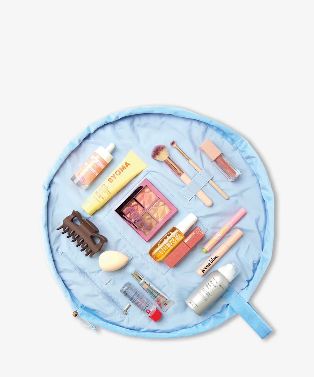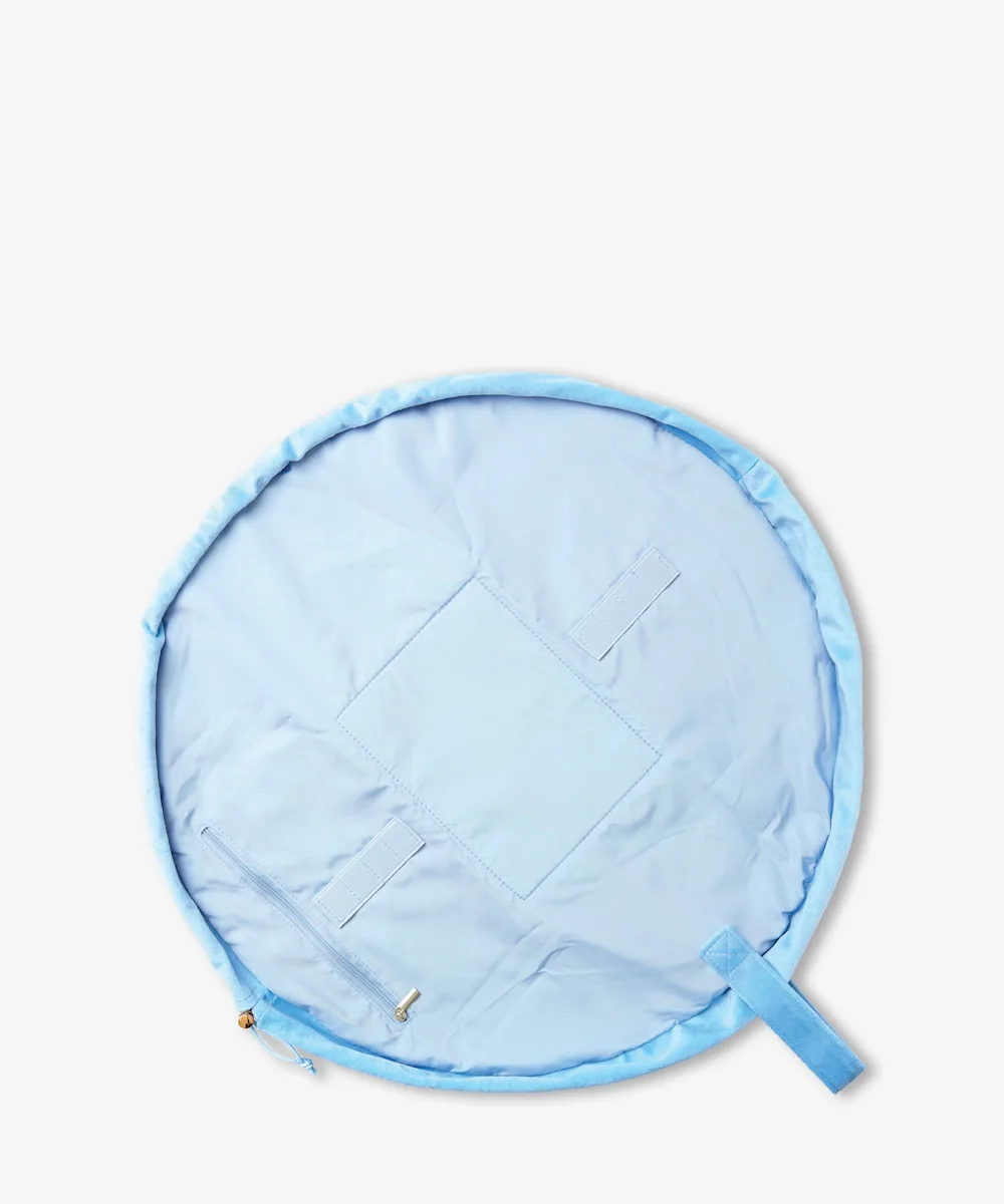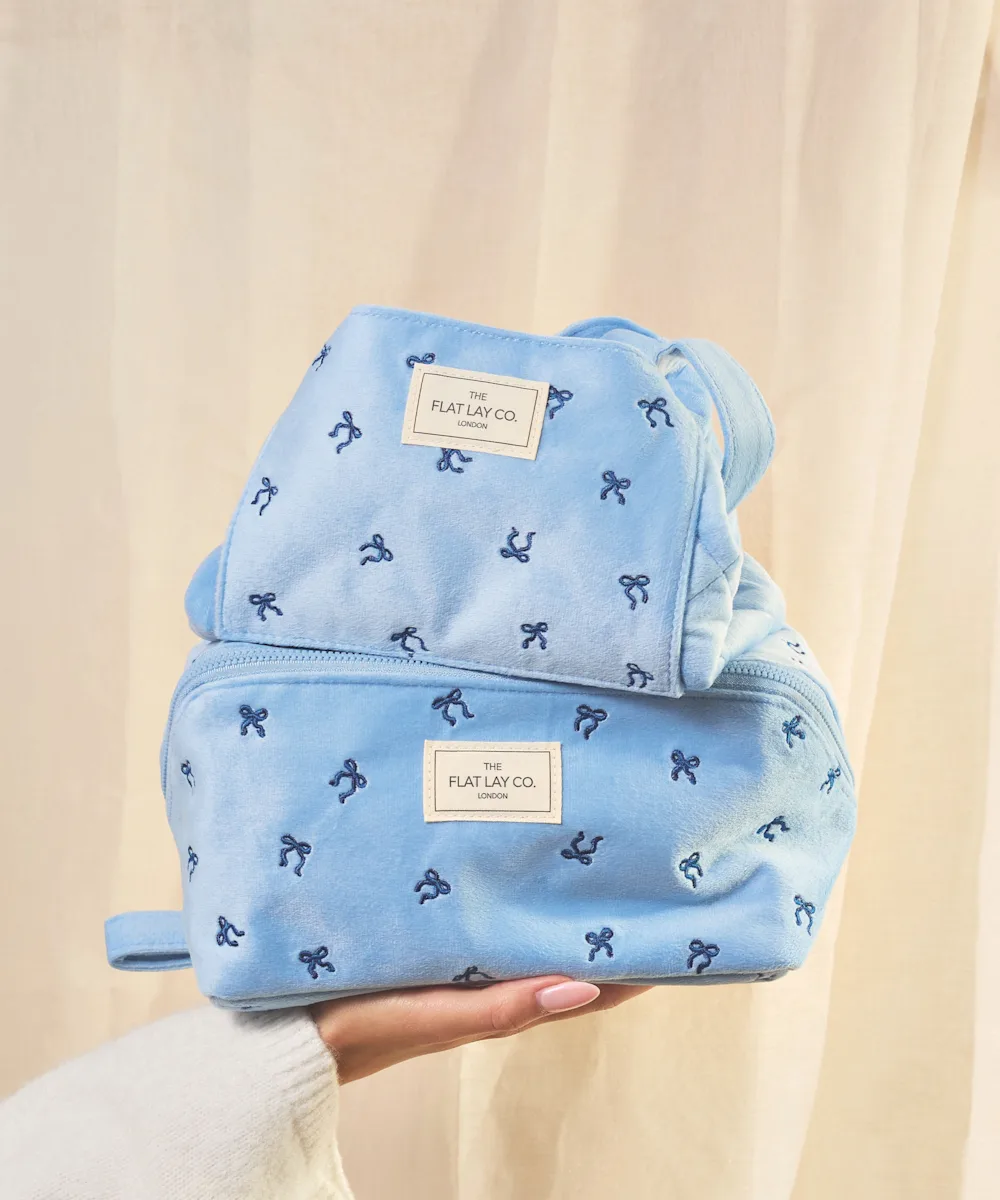 Drawstring Flat Lay Makeup Bag - Ditsy Bows Blue Embroidered Velvet