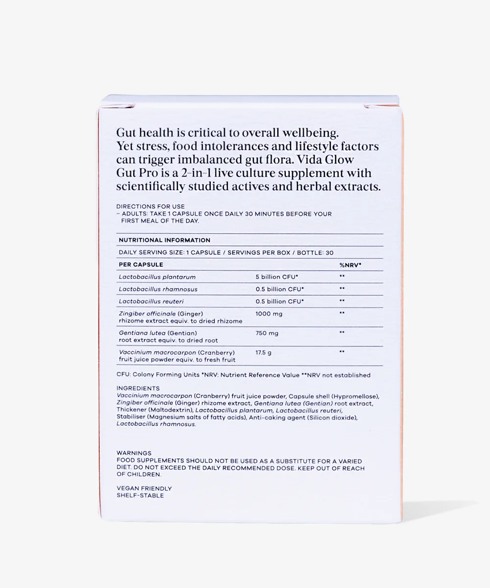 Add some gut-loving goodness into your daily routine with the Vida Glow Gut Pro. Designed to restore optimal gut function, these probiotic capsules help nourish good intestinal flora in both the gut and vaginal microbiome to minimise symptoms of gastrointestinal discomfort. Encouraging healthy digestion, these capsules use a blend of soothing ingredients to increase levels of beneficial bacteria and prevent harmful bacteria. Offering the gut the comfort it needs to thrive, these capsules work simultaneously to relieve bloating and support a healthy vaginal pH. Go with your gut on this one.