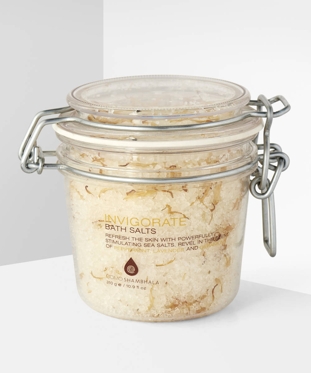 Add Como Shambhala Invigorate Bath Salts for the blend of eucalyptus, peppermint, geranium and lavender, perfect for nourishing the skin, reliving tension and stress, and creating a boujee spa experience.