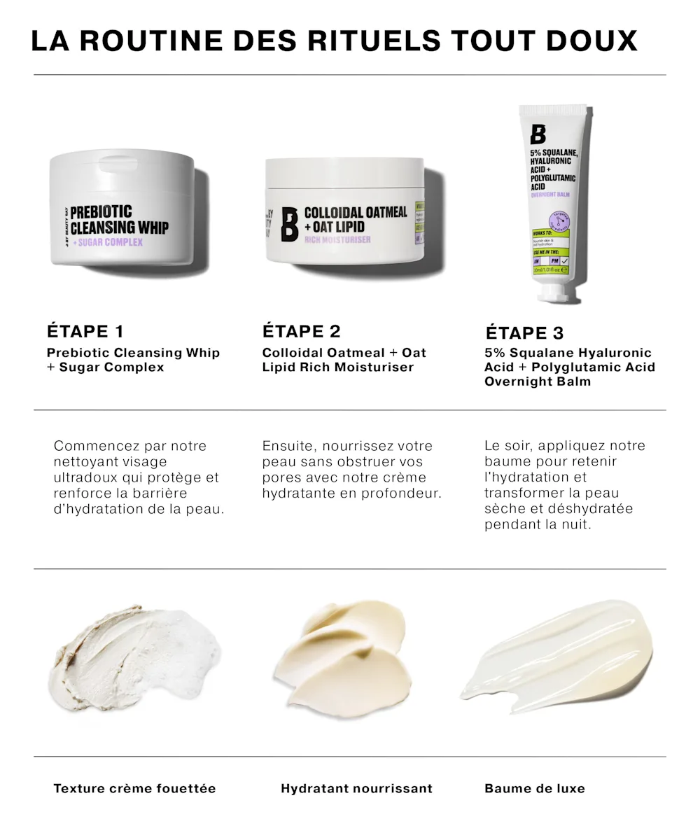 Take your pamper sesh to new levels with our Cosy Rituals Routine. Start with our ultra-gentle Prebiotic Cleansing Whip, which removes makeup as well as protecting and strengthening the skin’s moisture barrier. Follow with our Colloidal Oatmeal + Oat Lipid Rich Moisturiser that hydrates skin and helps it retain moisture without clogging pores. And finally, treat your skin to an extra dose of hydration with our 5% Squalane, Hyaluronic Acid + Polyglutamic Acid Overnight Balm, which transforms dry and dehydrated skin while you sleep.
