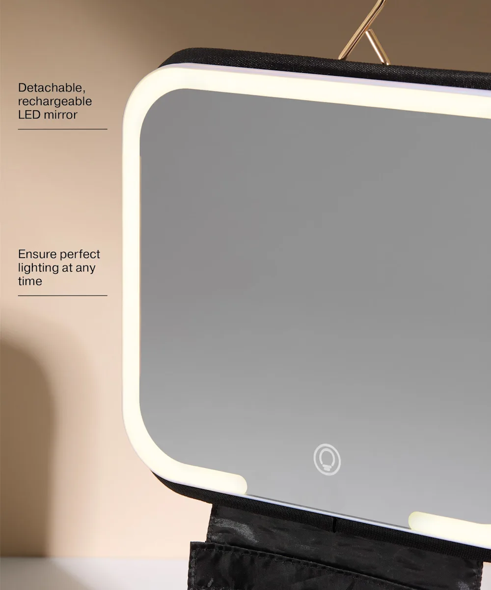 A fold-out beauty case with a detachable LED mirror, ideal for storing beauty, bath, and skincare essentials.