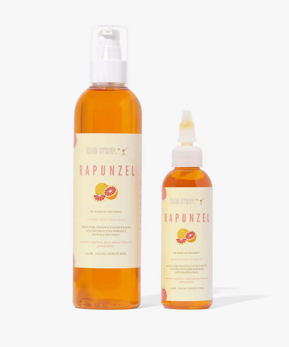 - 2 Rapunzel de Hair Syrup, 100ml et 300ml – Une huile de soin pré-shampoing riche en nutriments pour stimuler la croissance des cheveux, en huile de pamplemousse rose, un antioxydant efficace, ainsi qu’en extraits d’amande douce et de graines de lin pour traiter les mèches fragilisées et nourrir le cuir chevelu.