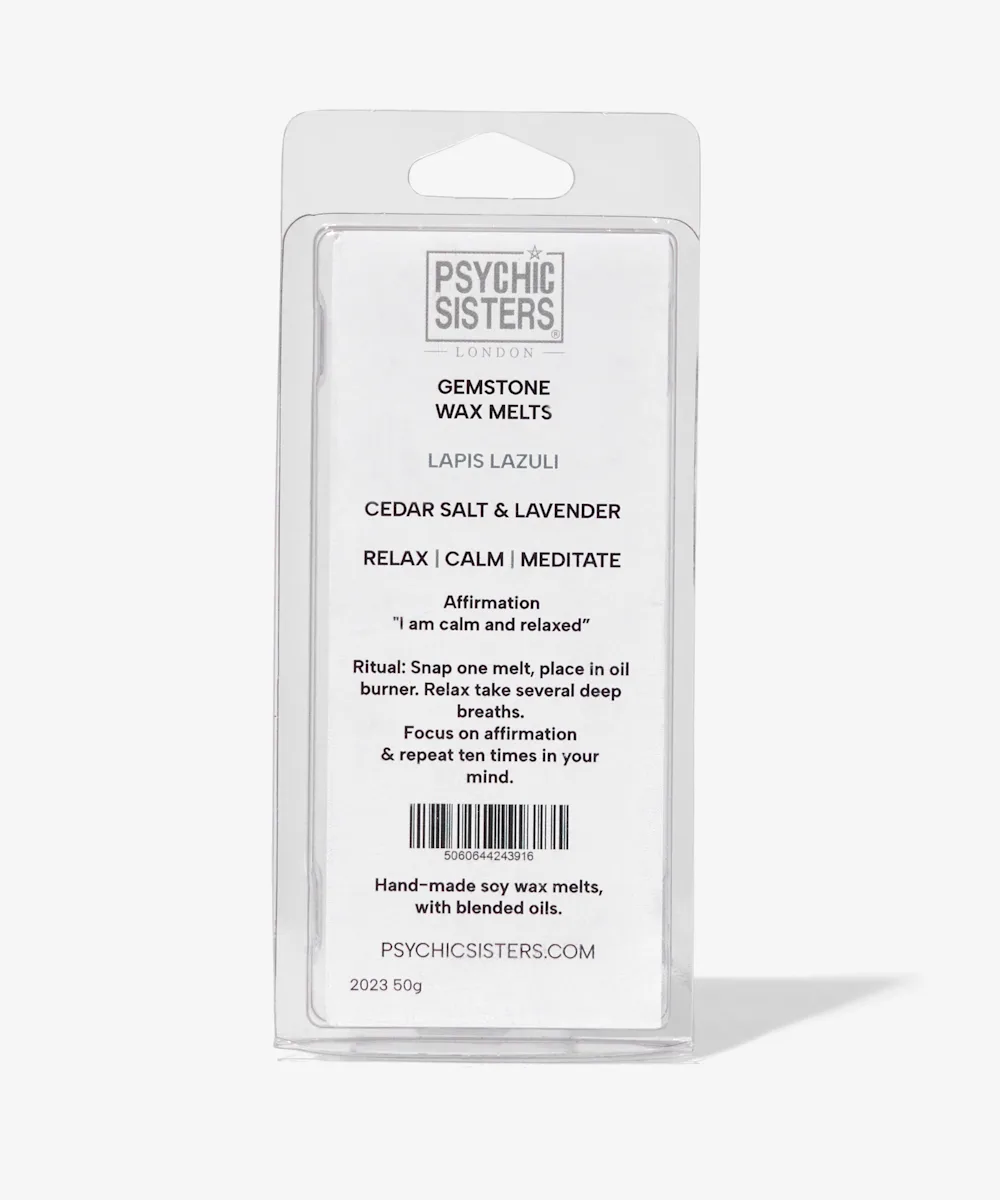 Embrace good vibes by hauling Psychic Sisters’ Gemstone Wax Melt in Blue Lapis. Reiki cleansed and cleared, these hand-blended soy wax melts are infused with pure essential oils for 15 hours of relaxing, room-filling fragrance. Scented with plum and rhubarb blended oils., these wax melts feature amethyst and lapis lazuli crystal chips to help with depression anxiety and insomnia for a clearer mind.