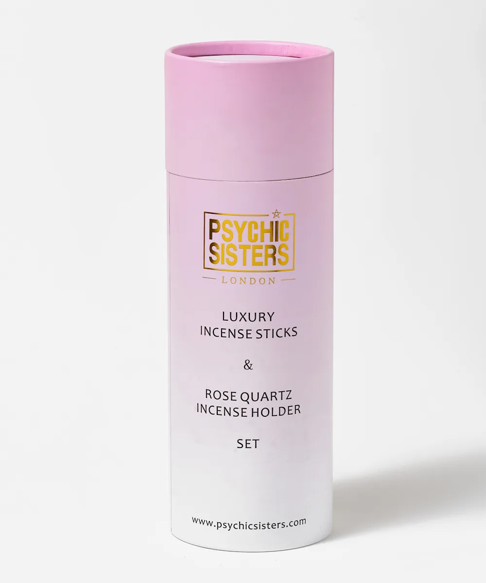 Offrez de bonnes vibrations avec le porte-encens en quartz rose accompagné de luxueux bâtonnets d’encens de Psychic Sisters. Fabriqué à la main avec des huiles essentielles pures, ce coffret a été conçu pour contribuer à promouvoir des sentiments de compassion, de paix et d’amour. Ces 15 bâtons d'encens et ce quartz rose ont été bénis en recourant à la magie de la lune et au Reiki énergétique.