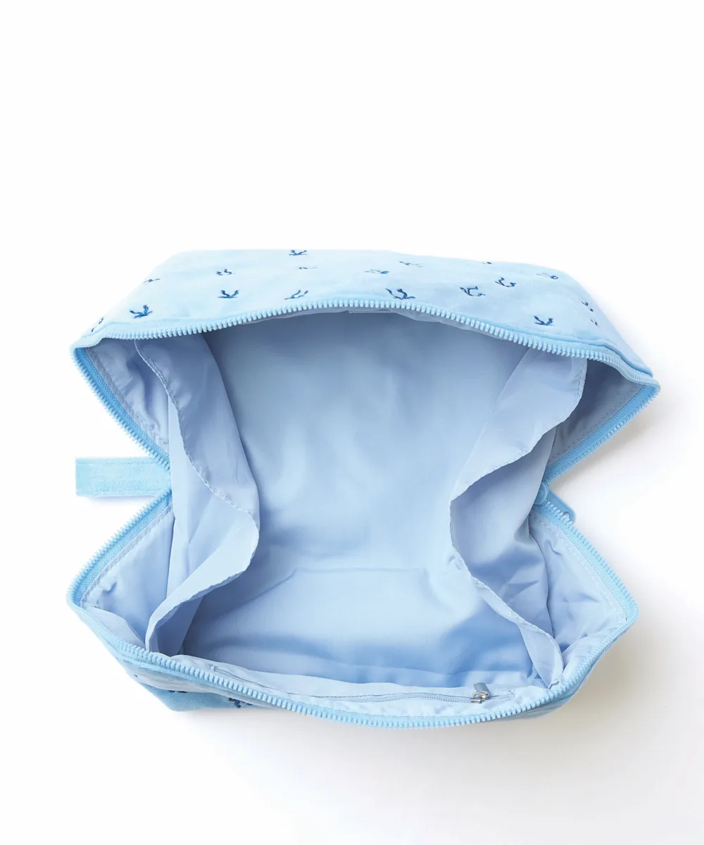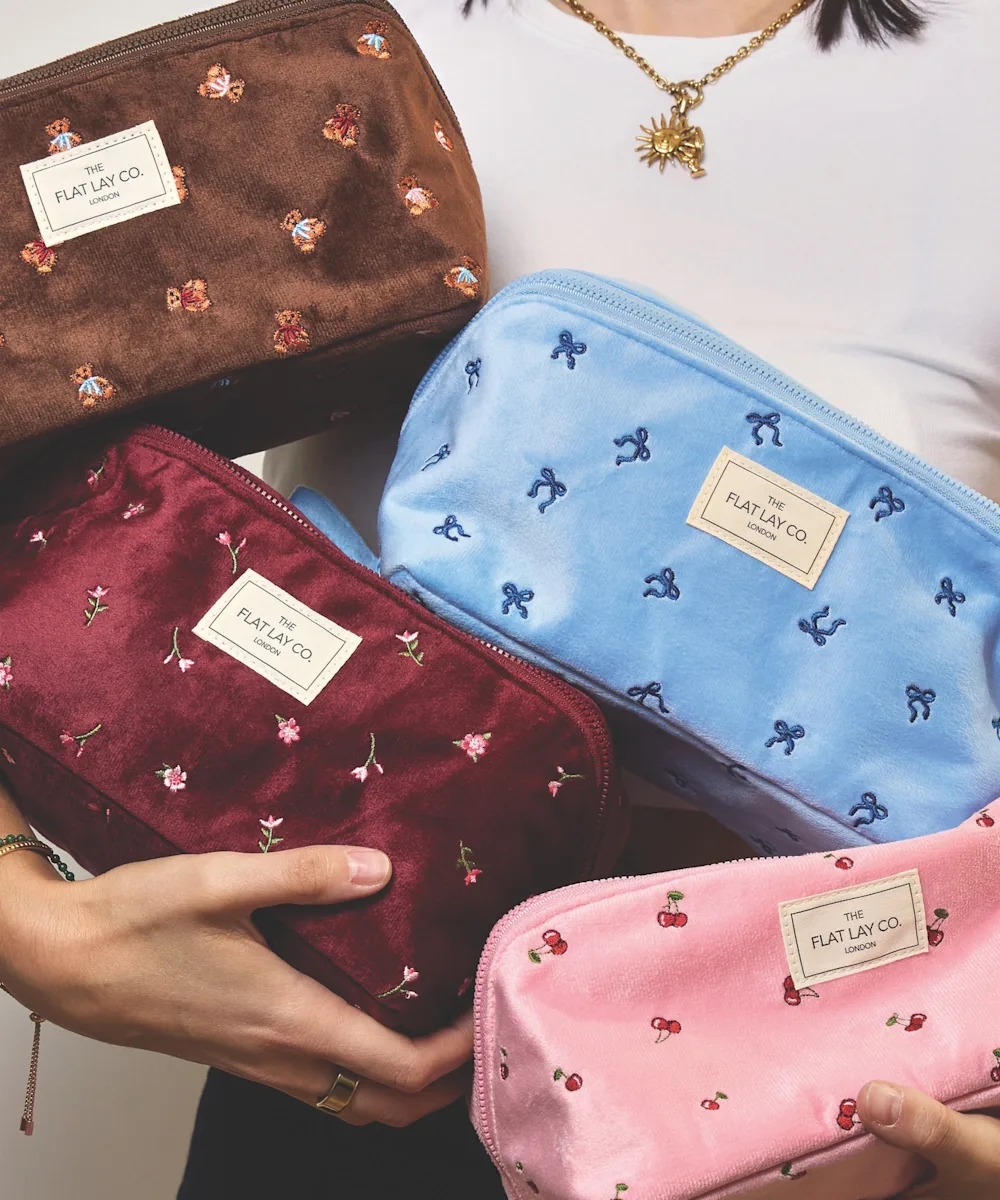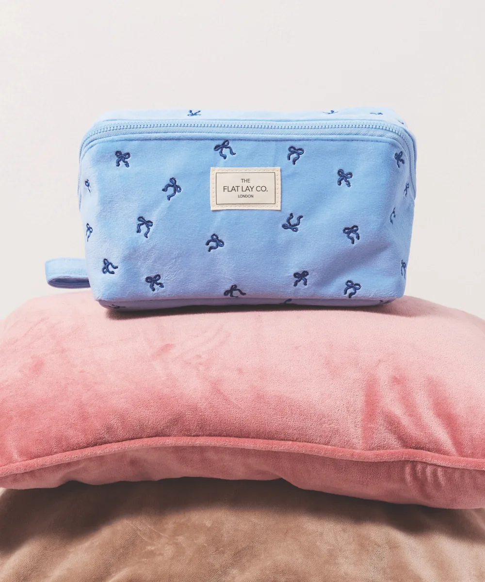 Flat Lay Makeup Box Bag - Ditsy Bows Blue Embroidered Velvet