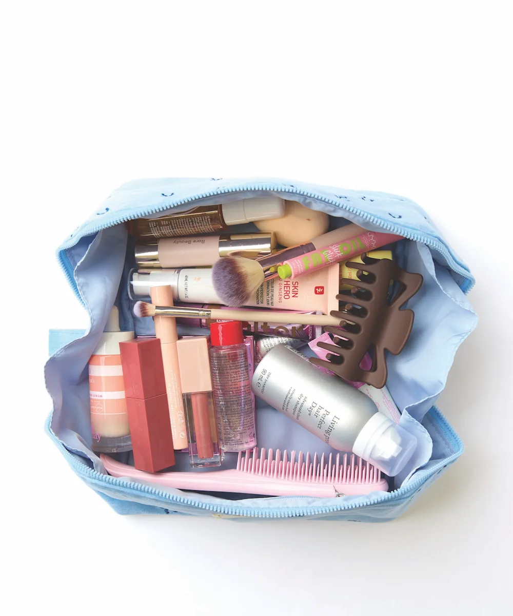 - Disposez votre maquillage sur le plateau, glissez vos pinceaux dans les étuis élastiqués pratiques et rangez tous vos petits objets comme des bijoux dans la poche intérieure zippée.