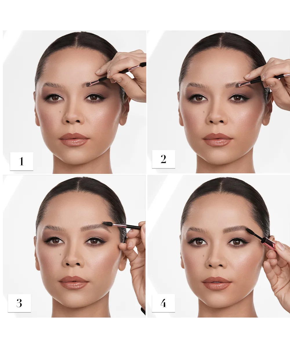 - On clean brows, brush through the brow using upward motions and gently pressing down as you go.