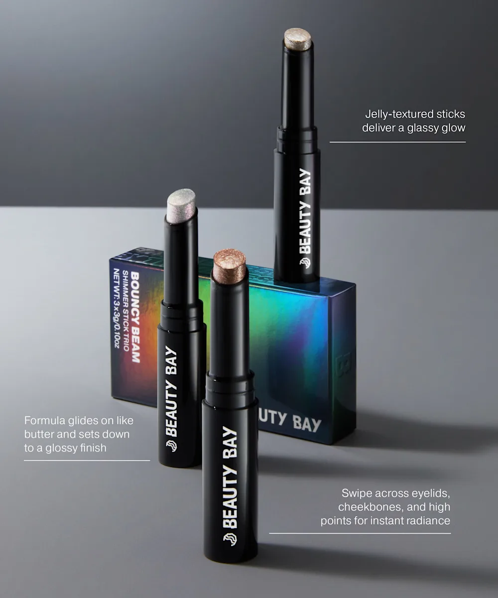 Bounce into buildable shine with the By BEAUTY BAY Bouncy Beam Shimmer Stick Trio. Featuring three party-ready shades, this limited-edition set of three jiggly, jelly-textured sticks is here to deliver a glassy glow wherever you want it. Soft and squishy to the touch, the formula glides on like butter and sets down to a glossy finish that catches the light in all the right places. Swipe across eyelids, cheekbones, and high points for instant radiance, or layer up for a bolder beam that still feels lightweight.