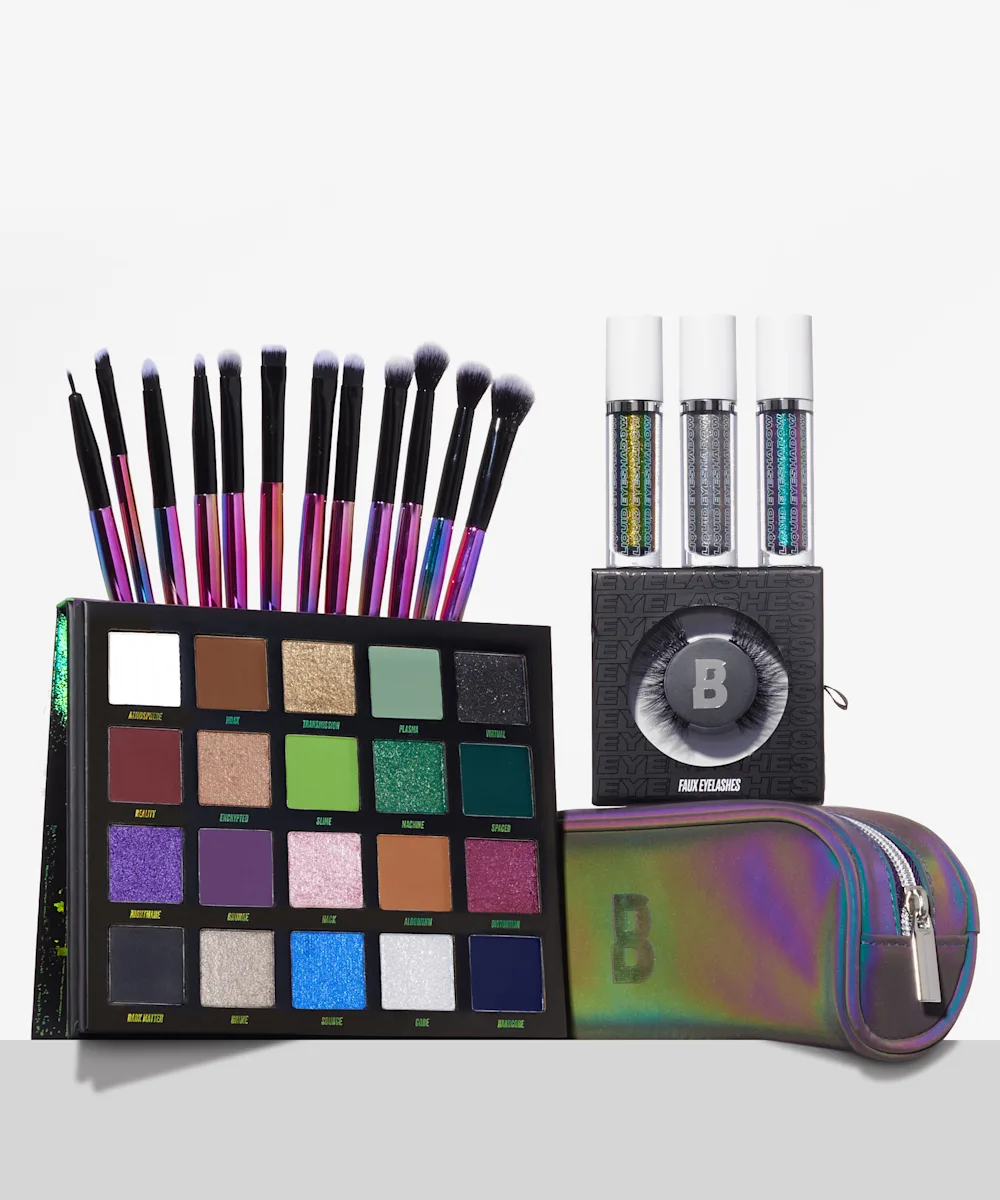A set containing an eyeshadow palette, a brush set, a set of three liquid chrome shadows and a pair of faux mink eyelashes.