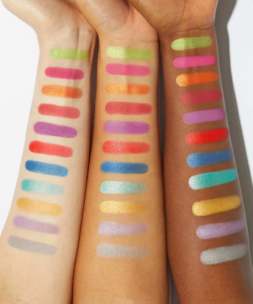 By BEAUTY BAY Bright 42 Colour Palette: Angel Cake, Preppy Pecan, Illicit, Candid Candyfloss, Tutu, Sweet Escape, Flamingo, Dragon Fruit, Just Peachy, Tangerine Dream, Orange Soda, Heat Wave, Rise & Shine, Bumble Bee, Lagoon, Splash, Riviera, Sapphire, Fairytale, Sugar Plum, Spontaneous, Amethyst. Ingredients: Talc, Mica, Titanium Dioxide (Ci 77891), Ethylhexyl Palmitate, Tin Oxide, Bis-Diglyceryl Polyacyladipate-2, Synthetic Fluorphlogopite, Silica, Polyisobutene, Dimethicone, Magnesium Stearate, Phenoxyethanol, Ethylhexylglycerin. May Contain (+/-): Red 6 (Ci 15850), Yellow 6 (Ci 15985), Yellow 5 (Ci 19140), Blue 1 (Ci 42090), Red 27 Lake (Ci 45410), Yellow 10 (Ci 47005), Ultramarines (Ci 77007), Chromium Oxide Greens (Ci 77288), Chromium Hydroxide Green (Ci 77289), Iron Oxides (Ci 77491, Ci 77492, Ci 77499), Ferric Ammonium Ferrocyanide (Ci 77510), Red 7 Lake (Ci 15850), Red 6 Lake (Ci 15850). White Lies, Bare Necessity, Platinum, Threat, Tutti Frutti, Make Them Wink, Head Over Heels, Hello Sunshine, Frosted Lime, Granny Smith, Oasis, Labyrinth, Paradise, Storm Night, Wisteria, Modern Way, Drama Queen. Ingredients: Talc, Mica, Titanium Dioxide (Ci 77891), Ethylhexyl Palmitate, Silica, Triethoxycaprylylsilane, Bis-Diglyceryl Polyacyladipate-2, Magnesium Stearate, Polyisobutene, Dimethicone, Phenoxyethanol, Ethylhexylglycerin. May Contain (+/-): Red 7 Lake (Ci 15850), Red 6 Lake (Ci 15850), Yellow 6 (Ci 15985), Yellow 5 (Ci 19140), Blue 1 (Ci 42090), Red 27 (Ci 45410), Ultramarines (Ci 77007), Chromium Oxide Greens (Ci 77288), Iron Oxides (Ci 77491, Ci 77492, Ci 77499), Ferric Ammonium Ferrocyanide (Ci 77510). Daydream. Ingredients: Talc, Mica, Triethoxycaprylylsilane, Silica, Bis-Diglyceryl Polyacyladipate-2, Titanium Dioxide (Ci 77891), Polyisobutene, Dimethicone, Magnesium Stearate, Phenoxyethanol, Ethylhexylglycerin, Iron Oxides (Ci 77491, Ci 77492, Ci 77499). Cherryade, Hot Stuff. Ingredients: Mica, Talc, Titanium Dioxide (Ci 77891), Ethylhexyl Palmitate, Silica, Bis-Diglyceryl Polyacyladipate-2, Polyisobutene, Dimethicone, Magnesium Stearate, Phenoxyethanol, Ethylhexylglycerin. May Contain (+/-): Red 7 Lake (Ci 15850), Iron Oxides (Ci 77491, Ci 77492, Ci 77499).